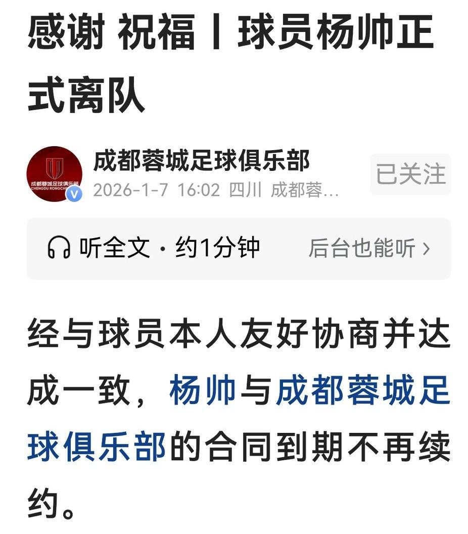杨帅昨天就穿上申花的队服,今天蓉城官方才发布不再与其续约,多少有点与常理不合。 杨帅在蓉城的表现中规中矩,所留印象并不深刻。过去的一年,蓉城中后卫人满为患,杨帅主要为李扬打替补,两个赛季出战40场有3助,机会超过国脚韩鹏飞和董岩锋。 如今杨帅转投申花,除蒋四朱五外,杨帅应该颇有竞争力,登场机会应比在蓉城多。人各有志,理当祝福!
