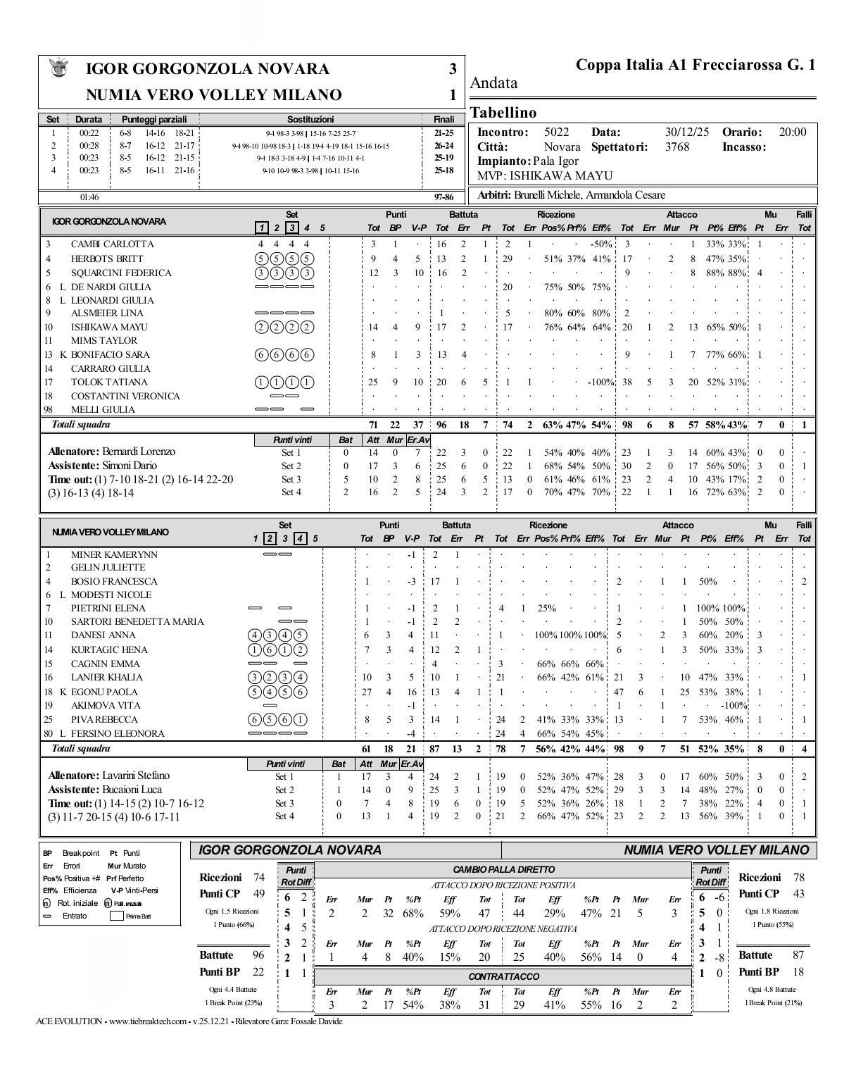 诺瓦拉出奇兵淘汰米兰,半决赛对阵科内利亚诺 2025-2026意大利杯女排四分之一决赛,诺瓦拉3-1击败米兰挺进四强,比分21-25, 26-24, 25-19, 25-18。半决赛,诺瓦拉将遭遇米兰。 今天诺瓦拉没有安排第一主攻阿尔斯迈尔主打,而是采用了石川和赫伯茨组合,可谓出奇制胜。埃格努27分全场得分王,卡多奇金娜25分紧随其后,石川真佑14分虽只排名第三,但奇兵建功荣膺MVP。 诺瓦拉: 卡多奇金娜38扣20中5失3被拦、0拦5发25分 石川真佑20扣13中1失2被拦、1拦0发14分 斯夸尔奇尼9扣8中0失0被拦、4拦0发12分 赫伯茨17扣8中0失2被拦、0拦1发9分 博尼法西奥9扣7中0失1被拦、1拦0发8分 坎比3扣1中0失0被拦、1拦1发3分 米兰: 艾格努47扣25中6失1被拦、1拦1发27分 拉尼尔21扣10中3失0被拦、0拦0发10分 皮瓦13扣7中0失1被拦、1拦0发8分 库尔塔吉奇6扣3中0失1被拦、3拦1发7分 达内西5扣3中0失2被拦、3拦0发6分 皮特里尼1扣1中0失0被拦、0拦0发1分 萨托里2扣1中0失0被拦、0拦0发1分 博西奥2扣1中0失1被拦、0拦0发1分 阿基莫娃1扣0中0失1被拦、0拦0发0分 诺瓦拉-米兰: 扣球得分:57-51 拦网得分:7-8 发球得分:7-2 对方送分:26-25 总得分:97-86 一传到位率:63%-56% 一传完美率:47%-42%