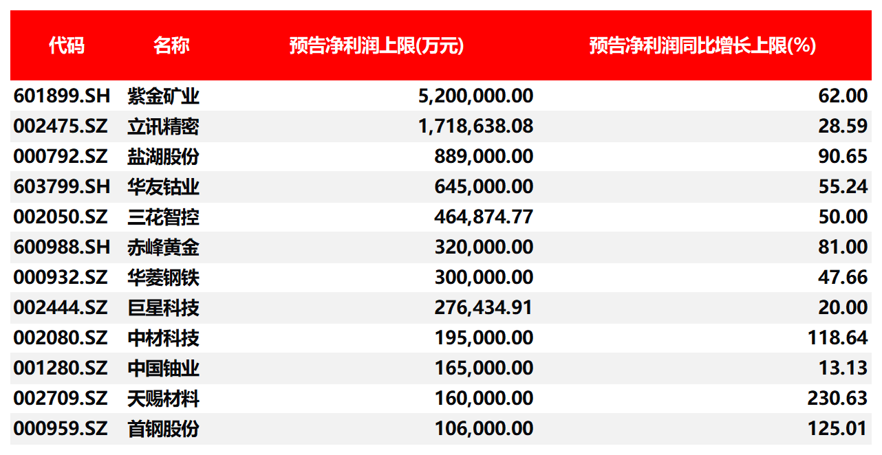 值得注意的是,除了紫金矿业,还有多只资源股如盐湖股份、华友钴业、赤峰黄金、华菱钢铁、中国铀业、天赐材料、首钢股份等位居预告净利润规模前列,其中盐湖股份预告净利增速上限达90.65%,天赐材料预告净利润增速上限达230.63%,显示锂电产业链头部公司在2025年业绩迎来高速增长。