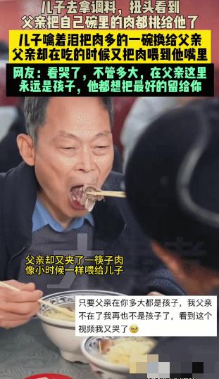 看哭了!河南,一男子带父亲去面馆吃面,谁知,父亲趁他去取调料的时候,偷偷将自己碗里的肉统统夹到儿子碗里,这一幕刚好被返回的儿子看到,他瞬间红了眼眶,坐下后默默将自己的碗与父亲对换了一下,而父亲接下来的举动让无数网友泪目! 如果你不仔细看,那张靠角落的桌子并没什么特别坐着两位两鬓斑白的男人,乍一看像兄弟,细看才觉出是父子。儿子约摸五六十岁,对面坐着的父亲早已是步履蹒跚、脸上布满褶子的七八旬老人。 老爷子也是饿了,一听说要吃面,脚步都轻快了几分。等到两大碗热乎乎的牛肉面端上来,两张脸都被雾气熏得红扑扑的。 儿子低头咂摸了一下,发现桌上的调味罐是空的。他四下张望,瞅见别桌有醋和酱油,便站起身去取。这时候店里的服务员正忙得脚打后脑勺,他也就不愿给人添乱,想着自己动手拿过来便是。 就在这短暂的空档,在那张无人注意的方桌上,一场蓄谋已久的“偷渡”发生了。刚才还喊着饿的老父亲,手里的筷子并没有伸向自己的嘴边。 他警惕地用余光瞟了一眼儿子离开的背影,确认“监护人”走远了,那双颤巍巍的手立刻忙活起来。他精准地夹起自己碗里的牛肉片,一片接一片,迅速却又小心地运送到对面的碗里。 如果只是夹过去,或许还会被一眼看穿。老爷子最绝的一手是,搬运完那珍贵的荤腥后,他还特意挑起那碗里的面条,仔仔细细地把肉盖了个严严实实。 这一幕,不仅被正好转身回来的儿子撞个正着,也被路人用镜头悄悄记录了下来。那做儿子的站在过道里,手里还拿着借来的调料瓶,脚下却像灌了铅。看着父亲那近乎本能的遮掩动作,他喉头一紧,眼眶瞬间就红了。 明明自己都已经是当爷爷的年纪了,在这个百般护着自己的老人眼里,他好像永远还是那个刚学会拿筷子、需要被额外照顾的幼童。那些藏在面条底下的不仅是肉,更是父亲一辈子都没改掉的习惯有好东西,第一反应永远是留给孩子。 为了不让老人家难堪,男子强行平复了那一瞬间翻涌的情绪。他假装什么都没看见,平静地坐回位子上。只不过,就在拿起筷子的那一刻,他十分自然地把两个碗对调了位置。 “这碗量太大了,我不饿,根本吃不完。”借口有些蹩脚,但这或许是成年人之间最温柔的谎言。 知子莫如父。对面的老爷子看着儿子的举动,哪里会不知道那点小心思。他没有去拆穿这个“谎言”,也没有在这个话题上推来让去。 老人接下来的动作,直接让这碗面的温情浓度达到了顶点。他没有再试图要把碗换回来,而是颤巍巍地伸出筷子,从那碗肉里夹起最大的一片,颤颤巍巍地递到了儿子嘴边。就像几十年前,在某个低矮的屋檐下喂这个孩子吃饭时一模一样。 已经是花甲之年的儿子,面对父亲递来的这一口,没有任何推辞。他配合地张大嘴巴,把那块牛肉接了过来。 咀嚼的那一刻,咸鲜的肉汁混着喉间强咽下去的酸涩,一齐滚进了肚里。那一刻,仿佛时光倒流,他不再是家庭的顶梁柱,不用硬撑着身为成年人的体面,在白发苍苍的父亲面前,他甚至有权利当众撒个娇。 这段画面被上传后,无数人在屏幕前模糊了双眼。这哪里是在吃面,分明是在咀嚼那些回不去的光阴。 这场景勾起了太多人的回忆拼图。有人想起了自家的饭桌,那个总说“我不爱吃肉”的父亲,总是一边把好菜往孩子碗里堆,一边低头吃着咸菜;还有人忆起那个除夕夜,在平时只有清汤寡水的年代,父亲也是这样,把奶奶分给他的那一点点油星,变魔术似的全转移到了儿子的碗中。 遗憾的是,这份如本能般纯粹的爱,常常要等到我们身为人父人母,岁月悄然染白青丝,垂垂老矣之时,方能真正领悟其中的深沉与厚重。而更残酷的是,当我们终于读懂了父亲把肉藏在面条下的良苦用心时,那个能替我们夹菜的人,或许已经不在了。 正如那位网友的叹息:现在我有了把所有肉都夹给父亲的能力,可是那个端碗的人却再也等不到了。 所以,若是那双这辈子只懂为你操劳的手还在,别犹豫,多陪他去街边吃碗面吧。不管你是在风雨里奔跑了多久的那个中年人,坐在他对面时,你依然可以是那个被宠溺地喂上一口肉的孩子。
