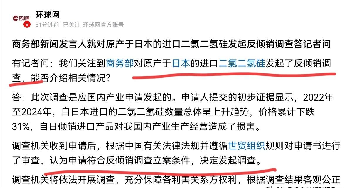 日本还没有回过神来,咱们又一棒子挥过去了! 1月7日,我们商务部发布二号令,对原产于日本的进口二氯二氢硅发起了反倾销调查。很显然,我们启动这个调查,这意味着日本的化工材料想要进入中国的市场更加困难了。 别觉得二氯硅烷看着不起眼,它可是芯片制造的刚需耗材,咱们平时用的逻辑芯片、存储芯片、模拟芯片,在生产过程中都得靠它来做薄膜沉积,不管是外延膜还是碳化硅膜,少了它根本造不出来。 说白了,这就是半导体产业链上的关键一环,谁掌控了它,谁就在芯片制造上多一分主动权。 咱们可不是随便发起调查的,这次调查是国内产业主动申请的,申请人是唐山三孚电子材料有限公司,去年12月8日就正式提交了申请材料。为啥要申请?核心就是日本的产品搞倾销,把国内产业逼得没法活了。 根据新华网报道的商务部官方说法,初步证据显示,2022年到2024年这三年里,从日本进口的二氯二氢硅数量越卖越多,价格却一个劲往下掉,累计跌幅都达到31%了。 这就是典型的“低价倾销”套路,用低于正常价格的方式抢占市场,挤压国内同类企业的生存空间,对咱们国内产业造成了实实在在的损害。 而且咱们办事全程守规矩,完全符合国际惯例。商务部收到申请后,对照着中国的相关法律法规,还遵循了世贸组织的规则,仔细审查了申请书和附带的证据,最后认定符合反倾销调查的立案条件,才正式发起调查的。 这次调查也有明确的时间范围,倾销调查期是2024年7月1日到2025年6月30日,产业损害调查期则从2022年1月1日开始,一直到2025年6月30日。按照规定,调查通常得在2027年1月7日前结束,特殊情况最多能延长6个月,所有流程都公开透明,让日本想挑刺都没地方挑。 可能有人会问,反倾销调查到底意味着啥?简单说,就是如果最后查实日本企业确实存在倾销行为,而且对国内产业造成了损害,咱们就可能采取临时反倾销措施,比如征收临时反倾销税,后续还可能出终裁措施,让日本产品的价格回归合理水平,不再具备不正当的价格优势。 这对日本相关企业来说,绝对是沉重打击。要知道,中国可是全球半导体产业的重要市场,对二氯二氢硅的需求一直在增长,失去了中国市场的价格优势,日本这些企业的产能和利润都会受很大影响,想再靠低价抢占份额就难了。 反观咱们国内的半导体材料产业,这次调查可是个重要的发展机遇。这些年咱们一直在推进半导体产业国产化,二氯二氢硅作为关键材料,国内企业早就开始发力了。就说申请调查的三孚股份,在电子级二氯二氢硅领域已经有了明显的技术和市场优势,产品质量很稳定,已经能批量给国内的龙头存储厂商、逻辑芯片厂商供货了。 除了三孚股份,华塑股份也在往这个领域转型,建了专门的电子级二氯二氢硅生产装置,还配套了电子级盐酸、烧碱等生产线,形成了完整的产品矩阵,他们的新项目已经完成机械竣工,马上就要试生产了。 之前因为日本产品的低价倾销,国内这些企业的发展多少受到了挤压。现在发起反倾销调查,就能把这种不公平的竞争环境理顺,让国内企业在公平的市场环境下和国外企业竞争。而且随着国内存储芯片产能不断扩张,对二氯二氢硅的需求还会持续增加,国内企业正好可以借着这个机会扩大产能、提升技术,进一步推进国产替代的进程。 毕竟半导体产业的核心技术买不来、求不来,只有咱们自己的企业强大了,才能摆脱对国外材料的依赖,真正掌握产业链的主动权。 其实这两年咱们针对国外不正当贸易行为的反击越来越果断,不是咱们好斗,而是为了维护国内产业的合法权益,守住公平竞争的底线。 之前不管是应对美国的贸易战,还是针对其他国家的倾销行为,咱们都是有理有据、有节有度,既遵守规则,又绝不退让。就像这次对日本二氯二氢硅的调查,每一步都有法律依据和事实支撑,完全是依法办事。 对日本来说,这次调查也是个提醒:想靠不正当手段在华谋利是行不通的,只有遵守市场规则,和中国企业公平竞争,才能在庞大的中国市场立足。如果还想着靠倾销这种老套路,最终只会搬起石头砸自己的脚。