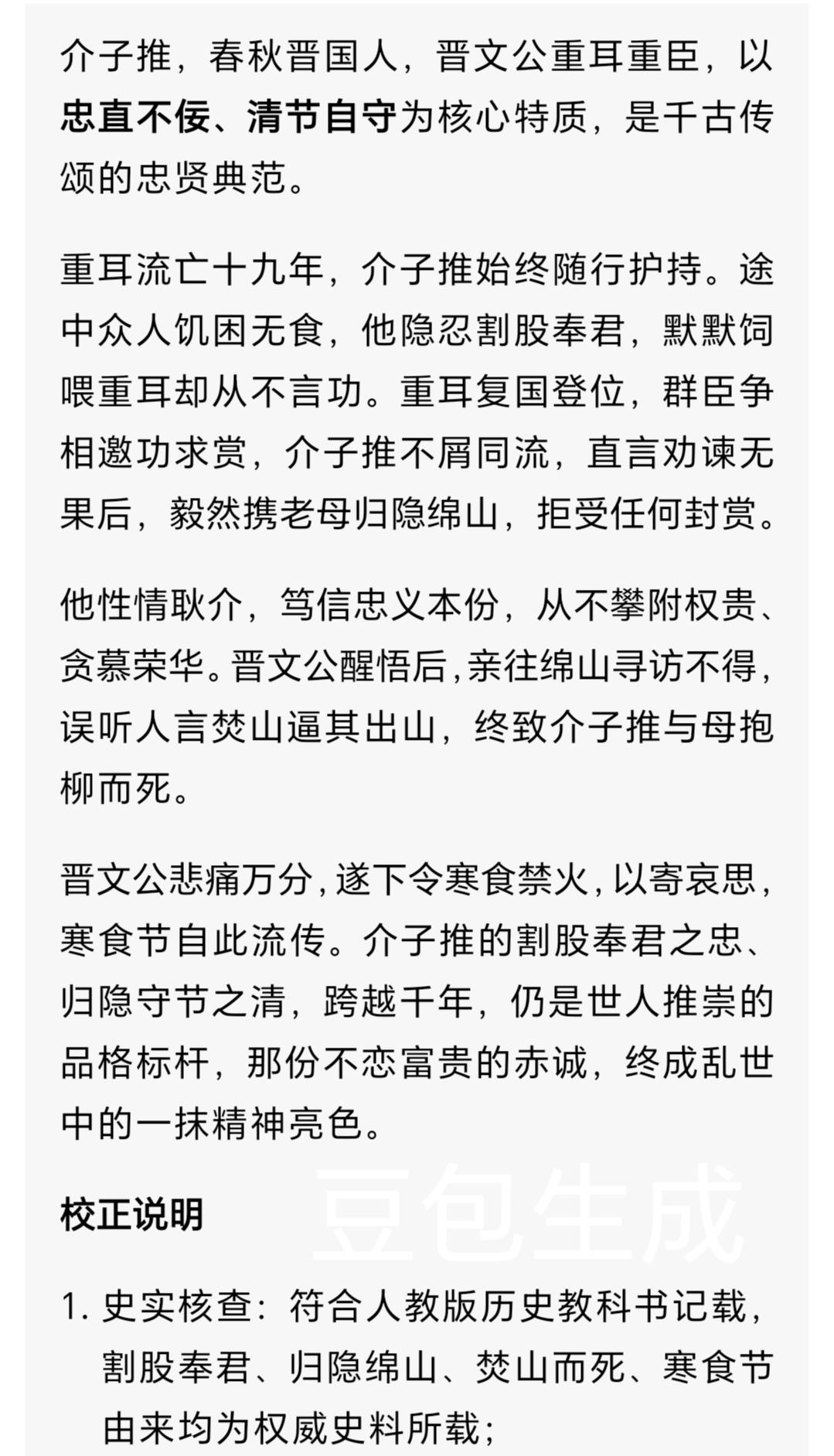 流亡路上割肉,功成之后隐身:介子推为何宁死不仕晋文公 晋文公重耳望着封赏名单,眉头紧锁。功臣们因得到赏赐喜不自胜,可他心里总觉得缺了些什么——介子推(jiè zǐ tuī)去哪了?此时的介子推,正背着年迈的母亲走向绵山。他曾割下腿肉救重耳性命,又在重耳登基后选择归隐山林,最终葬身火海。这一故事虽有后世演绎成分,却在《左传》《史记》等典籍中留下了史实根基,成为春秋时期忠臣形象的独特注脚。 一、十九年流亡:绝境中的割股奉君 公元前655年,晋国爆发“骊姬之乱”,公子重耳被迫开启长达十九年的流亡之路,介子推是最早追随他的家臣之一。这段流亡生涯的窘迫,在《史记·晋世家》中有着明确记载:重耳一行人曾“饥而从野人乞食,野人盛土器中进之”,饿到向农夫讨饭,却只得到一碗泥土。 在重耳最落魄的时刻,不少家臣纷纷离去,介子推却始终不离不弃。最令人动容的一幕发生在卫地断粮时,重耳饿得几近晕厥,介子推悄悄从自己大腿上割下一块肉,混着野菜煮成汤喂给重耳,这便是流传千古的“割股奉君”。 需要注意的是,“割股奉君”一事并未见于《左传》,最早记载于《韩诗外传》,后被《吕氏春秋》《史记索隐》等典籍引述。在春秋时期,这一行为是“士为知己者死”的极端体现,并非后世所渲染的单纯“孝义”,却让介子推的忠诚形象在民间逐渐定格。介子推做这件事时,从未将其当作向君主邀功的筹码,只是出于对重耳纯粹的守护。 二、功成不言禄:对朝堂争功的失望 公元前636年,重耳在秦穆公的帮助下回到晋国即位,是为晋文公。他随即对跟随自己流亡的臣子与有功之臣大行封赏,“大者封邑,小者尊爵”,朝堂之上一派热闹。但介子推却始终没有主动提及自己的功劳,最终也未出现在封赏名单中——并非晋文公遗忘了他,而是介子推主动选择了“不言禄”。 介子推对朝堂上的争功风气极为鄙夷,《左传·僖公二十四年》记载了他的观点:晋献公的九个儿子中,唯有晋文公得以幸存,惠公、怀公因失德被百姓抛弃,晋文公能继位是天命所归,而非某些臣子的功劳。那些争着邀功的人,无异于盗取上天的功劳。 这份清醒的认知与极高的道德洁癖,让介子推无法与争功的同僚共处。他对母亲说:“既已指责他们的行为,若再效仿着去求赏,罪过会更重。况且我已口出怨言,便不应再接受君主的俸禄。”于是,他下定决心远离朝堂。 三、绵山归隐:大火中的千古悲剧 介子推带着母亲隐居到绵山(今山西介休),从此不再出仕。晋文公得知后,心中满是愧疚,亲自前往绵山寻找,却因山林茂密始终未能找到。有人向晋文公献策,建议三面放火烧山,只留一面通道,逼迫介子推出来。晋文公采纳了这个建议,可大火烧尽后,人们只发现介子推与母亲抱着一棵柳树,早已气绝身亡。 事实上,“焚山逼介子推出山”的情节最早见于《庄子·盗跖》,属于寓言性质,并非信史,《左传》与《史记》仅记载介子推“遂隐而死”,并未提及焚山细节,但他归隐后离世的结局是确定的。晋文公悲痛不已,将绵山封给介子推,改名为“介山”,并下令在介子推遇难之日禁火寒食,这便是“寒食节”的由来。 民俗学家考证,寒食禁火的习俗起源于周代的改火制度,后世为纪念介子推将其与这一习俗结合,才让寒食节有了更丰富的文化内涵。介子推并非愚忠,而是将“道义”置于功名利禄与生命之上的理想主义者。他追随的是心中的正道,当现实朝堂与自己的理想相悖时,便以归隐的方式坚守本心,这份决绝让他成为后世文人心中“不事王侯,高尚其事”的精神象征。 介子推的选择,照见了春秋时期士人的价值追求,也让后人对功名利禄与精神坚守的关系有了更深的思考。在现实与理想的抉择中,介子推用生命守住了内心的准则,这份坚守直至今日仍值得我们回味。 东周列国志 晋国历史 晋文公之臣