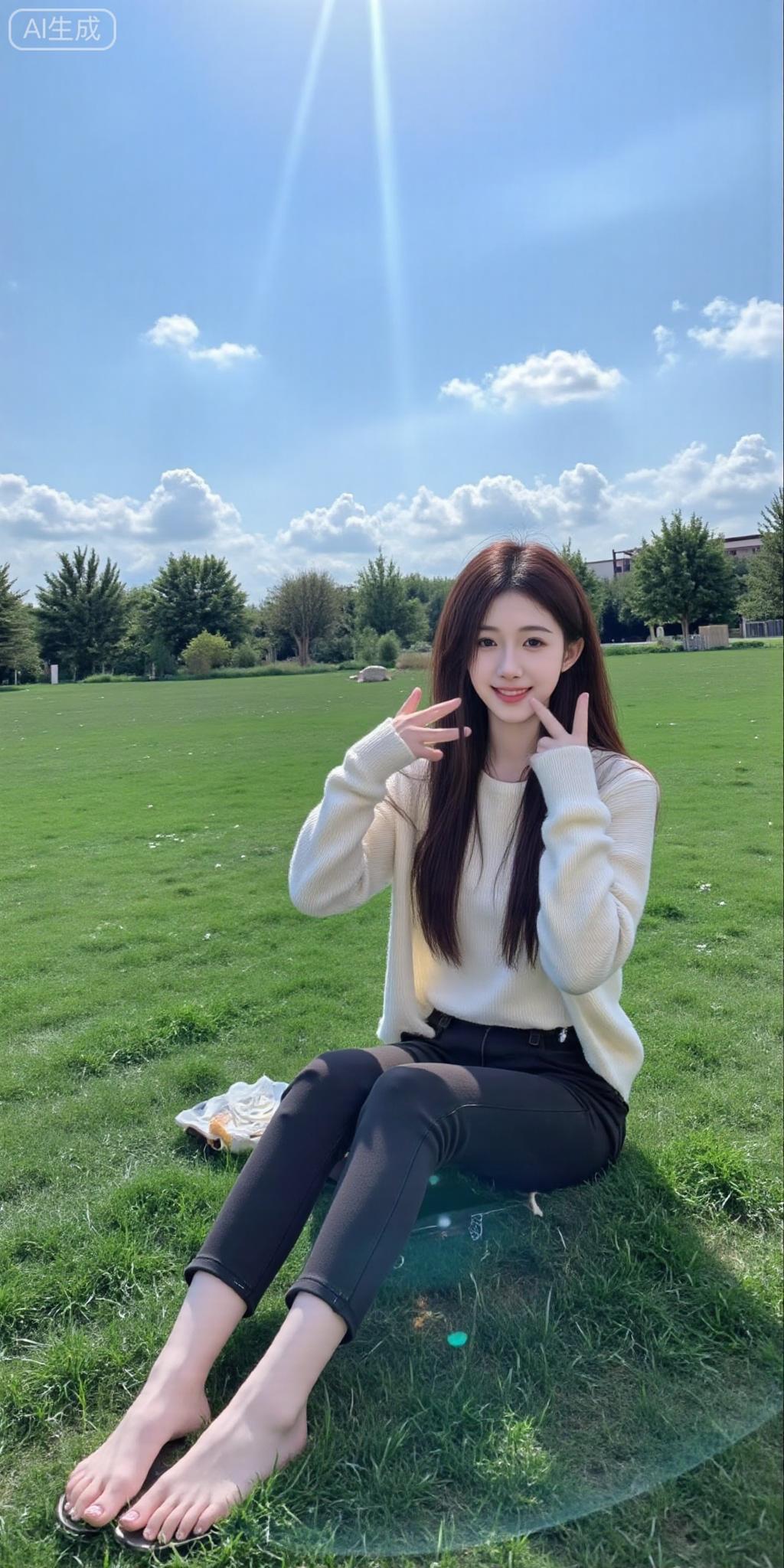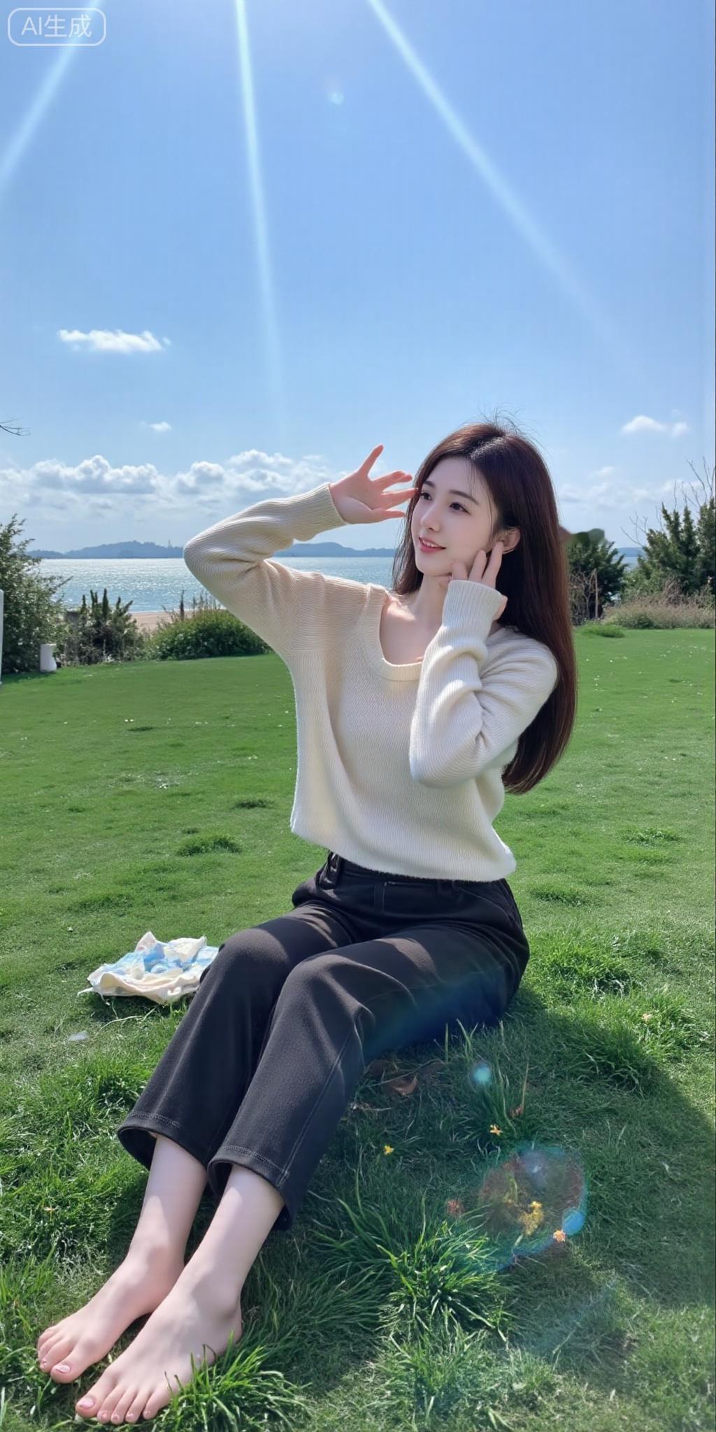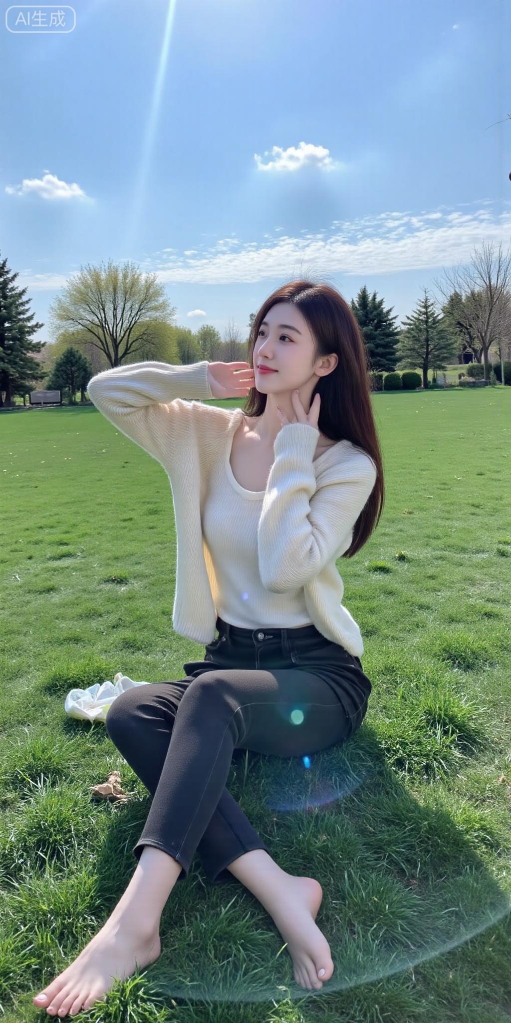 一位女孩在春日阳光下惬意休憩的温馨场景。她身穿米白色针织开衫和黑色紧身裤,赤脚坐在绿意盎然的草地上,姿态放松优雅。阳光透过蓝天白云洒落,远处绿树成荫,整个画面洋溢着宁静、自然的春日气息,充满了悠闲与治愈感。明媚动人穿搭 灰色休闲毛衣女