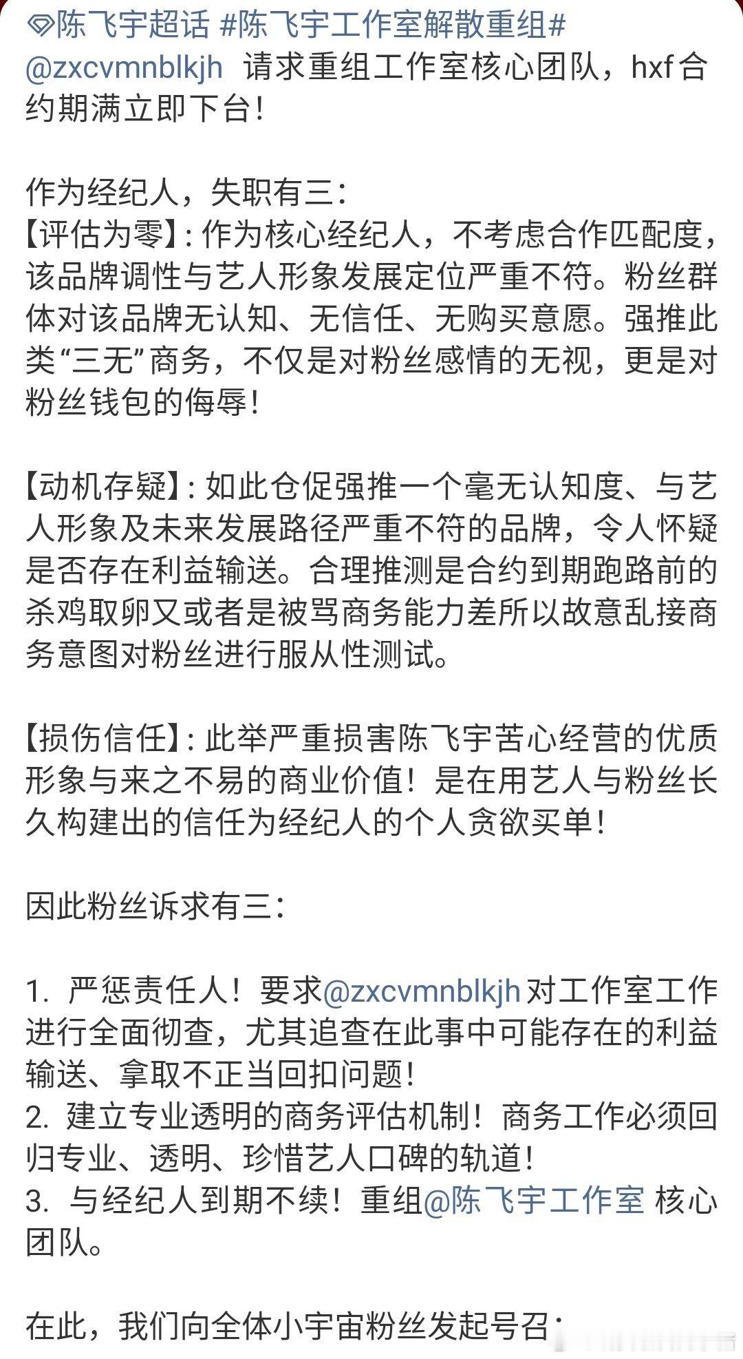 陈飞宇后援会回应粉丝诉求,表示内部会进行调整