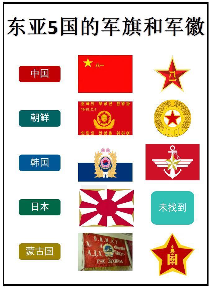 盘点东亚5国的军旗和军徽,对比一下哪个最好看? 在亚洲东亚地区,盘踞着五个国家,分别是中国、朝鲜、韩国、日本、蒙古国。 我只认识中国的军旗和军徽,为了找到其他国家正确的军旗和军徽,用了好长时间,遗憾的是没有找到日本的军徽。 其他四国的军徽,都有一个相同的图案,五角星。 对比已知的,还是感觉自家的军旗和军徽看着亲切,不仅简约,而且大气。至于哪一个更好看就留给评论区的朋友吧!