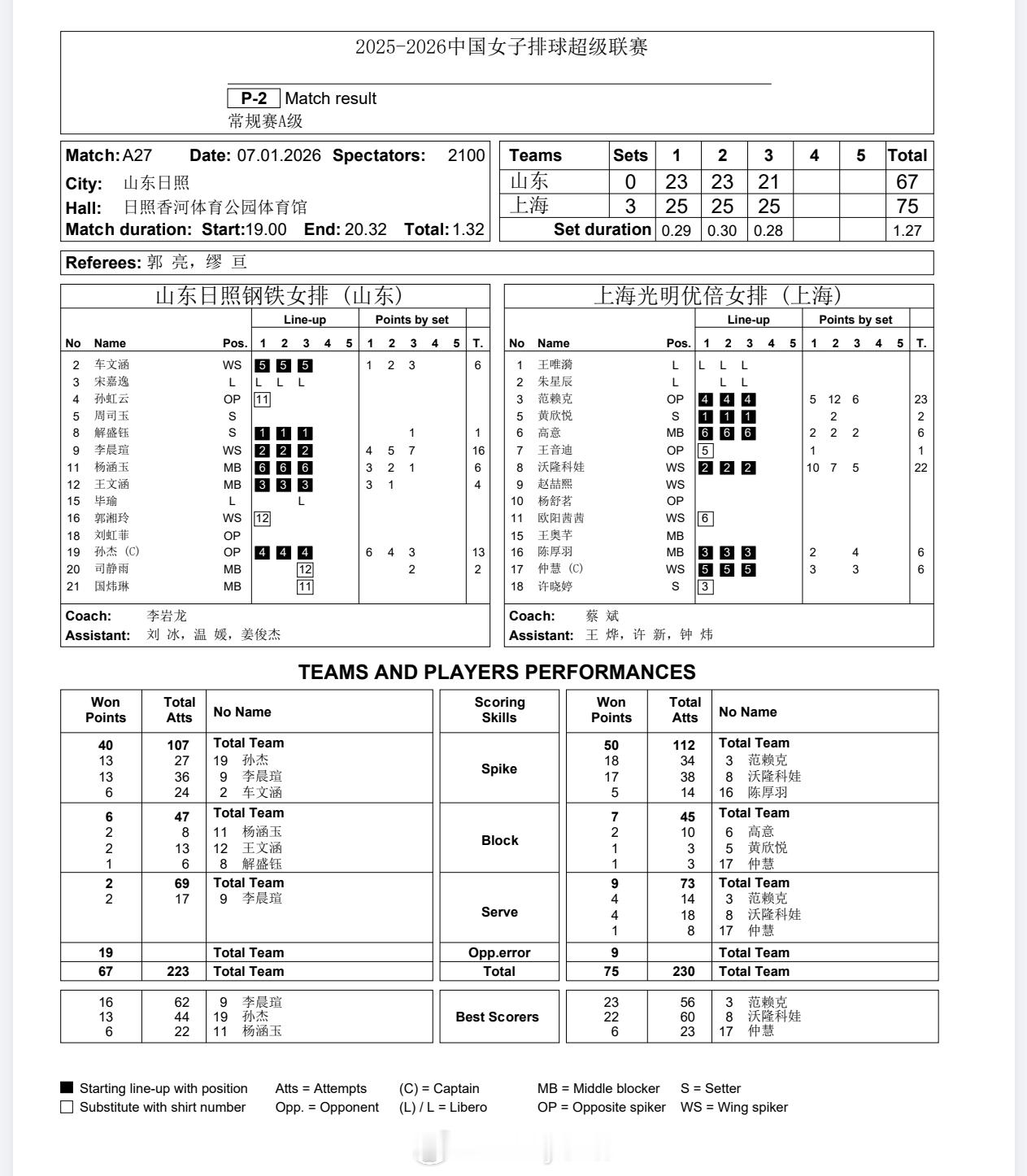 【技术统计】排超联赛第7轮,山东女排 0比3上海女排(23-25 23-25 21-25),双外援合力砍下45分排超联赛2025-2026中国排球超级联赛