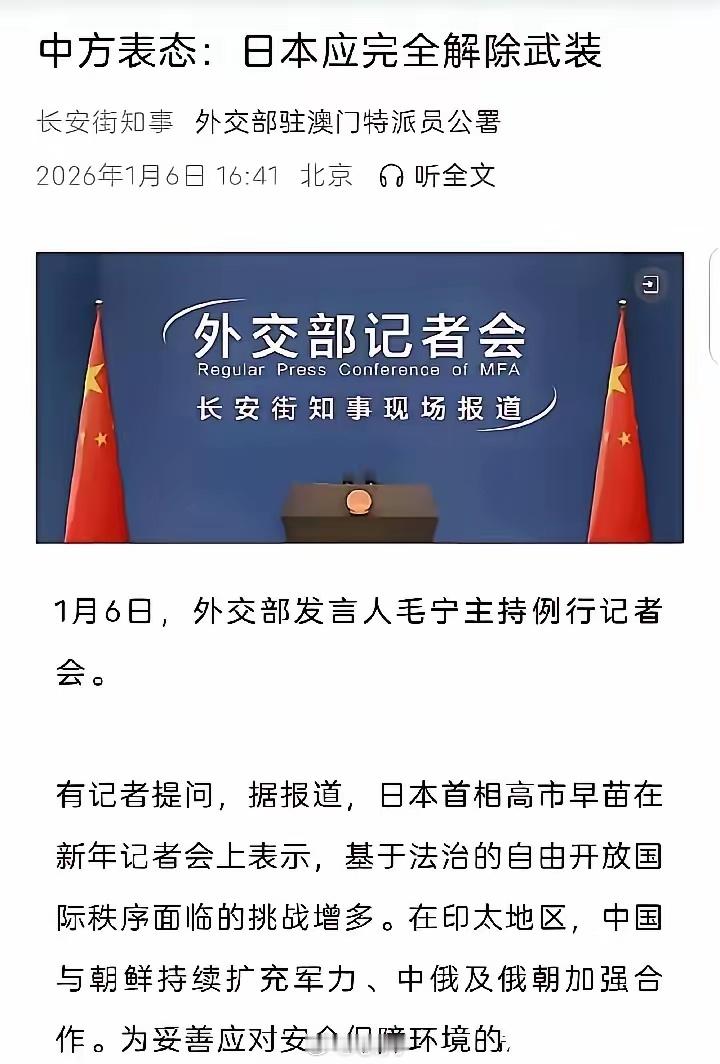 中日博弈升级! !!中方表态:日本应完全解除武装 (日本就中方加强出口管制提出抗议)这下小日子的好梦彻底碎了!中方这次是动真格的了,明确要求日本必须完全解除武装!这不是在跟他们商量, 这是给他们的最后通牒!大家现在就瞧好吧,看看这群向来狡猾的倭人会怎么演戏。他们是乖乖听话解除武装,还是想硬抗到底?告诉他们,别做梦了!如果他们敢不从,接下来的制裁绝对不是现在这种“两用物项管制”能比的,那将是毁灭性的打击!!这一次,必须让他们彻底老实!!!专栏 · 中美博弈|俄美博弈|中俄联手|寰球动态