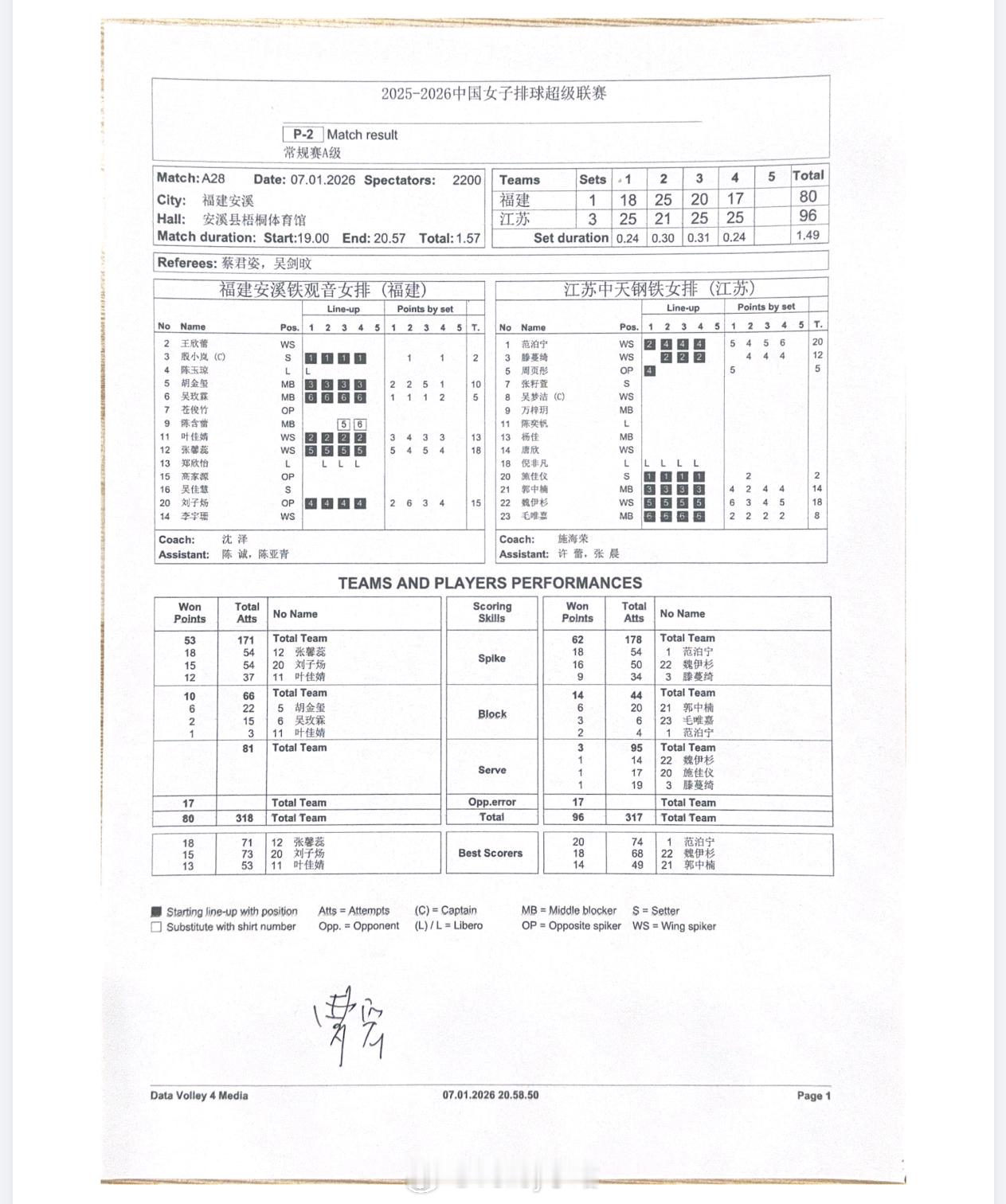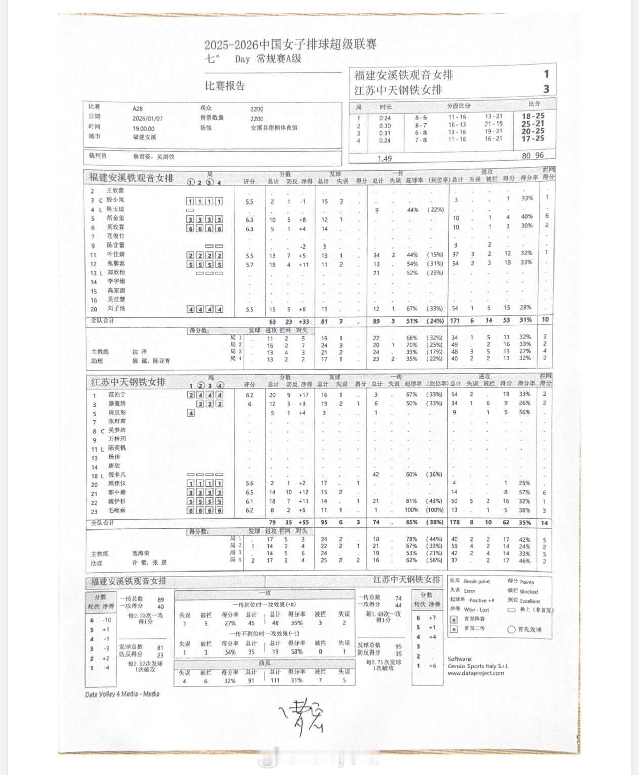 【技术统计】排超联赛第7轮,福建女排 1比3江苏女排(18-25 25-21 20-25 17-25)排超联赛2025-2026中国排球超级联赛