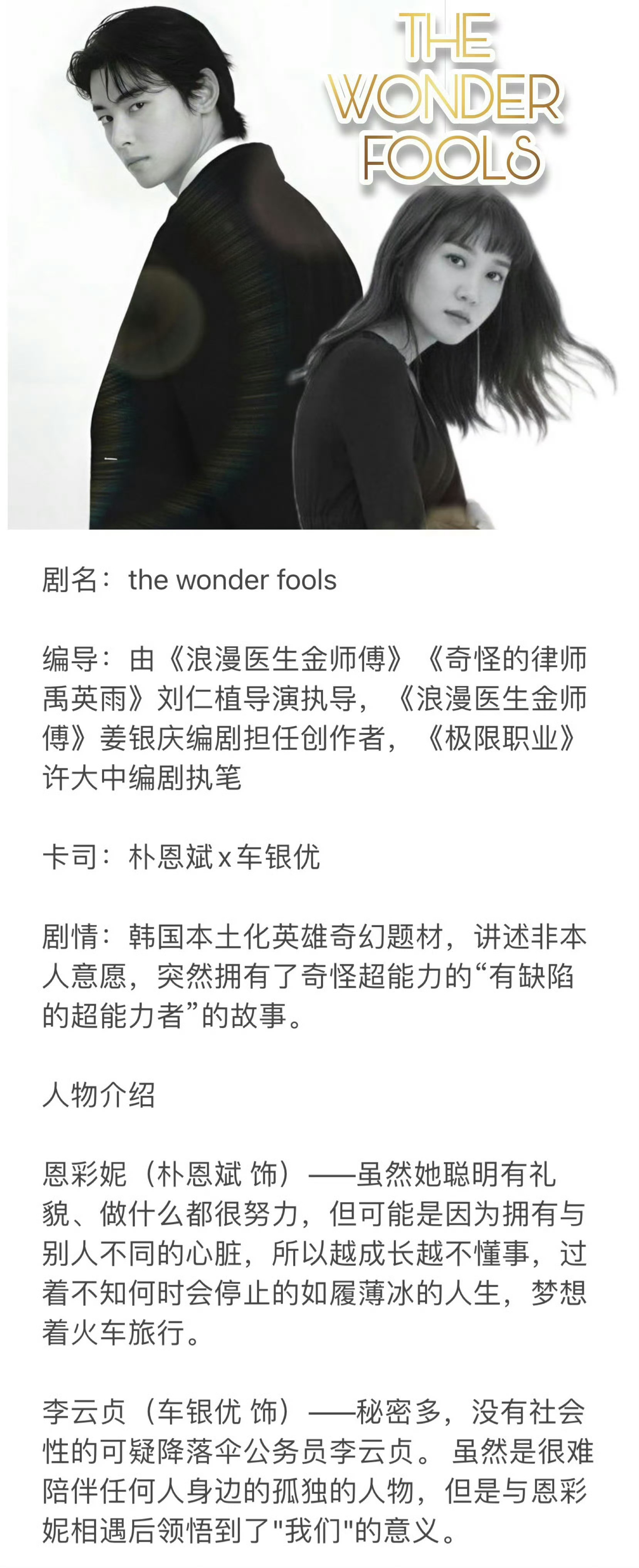 the wonder fools 朴恩斌x车银优|预告海报&剧照今年终于要播了~~剧情&人设👉图3 是一部超能力喜剧动作冒险片,在末日论占上风的1999年,因意外事件而获得超能力的村里呆瓜们与威胁海城市和平的坏人展开斗争