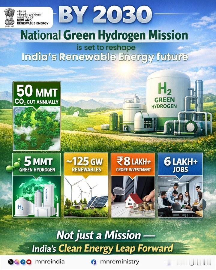 印度国家绿色氢能使命于2023年1月启动,目标是到2030年使印度成为全球绿色氢能生产、使用和出口的中心。 主要目标: 到2030年,建立至少每年500万吨(MMT)的绿色氢能生产能力。 减少每年约50 MMT的二氧化碳排放量。 预计吸引超过8万亿卢比(约合1000亿美元)的总投资。 创造超过60万个就业岗位。 累计减少超过1万亿卢比的化石燃料进口。 关键组成部分: SIGHT计划:为电解槽制造和绿色氢能生产提供财政激励。 试点项目:在难以减排的行业(如钢铁、航运、交通)进行示范项目。 研发(R&D):通过公私合作伙伴关系(SHIP)框架促进技术创新。 基础设施:开发绿色氢能枢纽和必要的储存、运输基础设施。 实施与协调: 使命由新能源和可再生能源部(MNRE)负责全面协调和实施。 印度正致力于利用其丰富的可再生能源潜力,利用绿色氢能实现经济脱碳并确保能源安全。