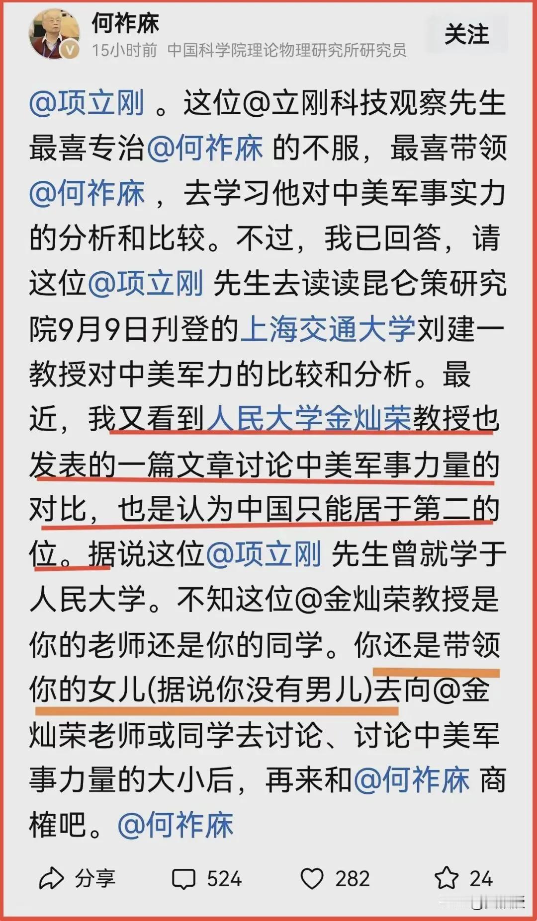 何祚庥院士说的 关于军事力量对比 客观的说 你同意吗?