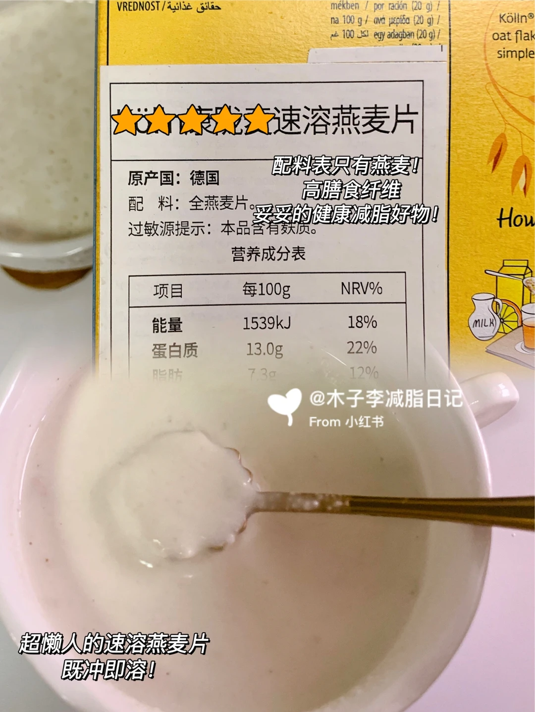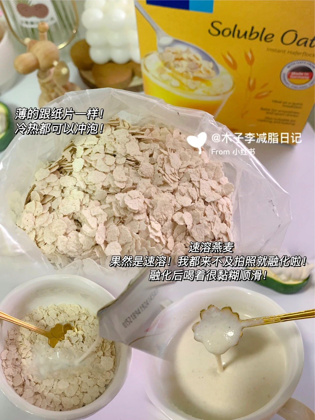 📣:速溶燕麦片俺还是第一次见!就不用开水都能溶!我用牛奶冲泡还没拍照就溶没了!适合咱减肥懒人随冲随喝~静止一会会有些粘稠喝着麦香醇厚,还抗饿~燕麦的膳食纤维高!还可和其他饮品搭配喝!清爽无负担!