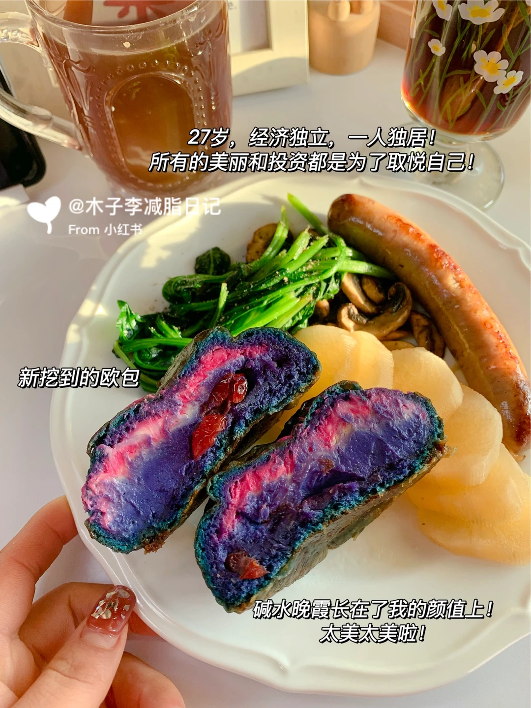 🍳早餐:晚霞碱水➕挂耳黑咖➕小仙汤➕雪莲果➕菠菜➕口蘑➕煎肉肠