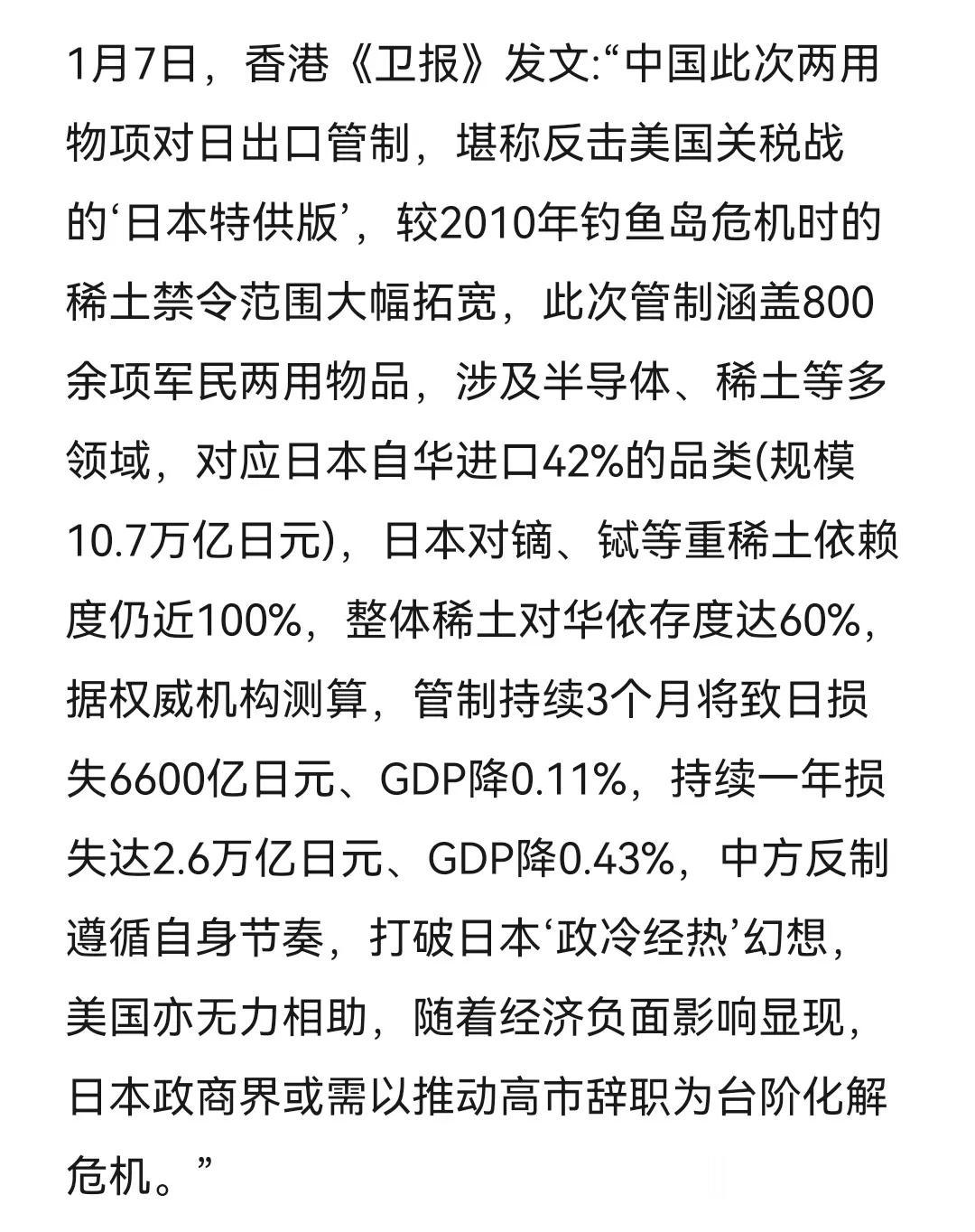 东大此次实施两用物项对日出口管制措施,俨然是反击美国关税战的‘日本特供版’。 既然高市早苗及日本右翼分子仍死不悔改,咱们就给他们来点狠的。 据相关机构判断,管制实施3个月,日本会损失6600亿日元、GDP下降0.11%;管制实施一年,日本损失会达到2.6万亿日元、GDP下降0.43%,损失可谓严重。 或许两国之前冲突事件中出现过“政冷经热”的现象,让日本右翼分子认为今次由高市早苗的讲话引发的两国外交风波,结果应该和以往差不多,政治外交上趋于冷淡,经济上仍频繁来往。 显然日本右翼分子打错了算盘,1月5日高市早苗在讲话中还希望扭转两国紧张关系,不过她的幻想很快就破灭了,第二天东大立刻颁布军民两用物项对日出口管制,出招快准狠,根本没给对方反应机会,东大祭出杀手锏是基于这位女首相仍然不肯收回所说的话。 东大此举,无疑会引起日本国内的强烈反响,他们或许会提出一系列质疑:高市早苗是否预估到中方的管制措施?政府会如何应对?两国关系的走向? 未来3个月至半年内,日本经济一旦下滑,现在高市早苗颇高的民调数据,会毫无疑问地直线往下跌,假如经济再进一步恶化,估计日本政商界和普通民众会开始讨论高市早苗是否应该趁早下课的问题。 2026年才开始,但留给高市早苗的时间不多了。