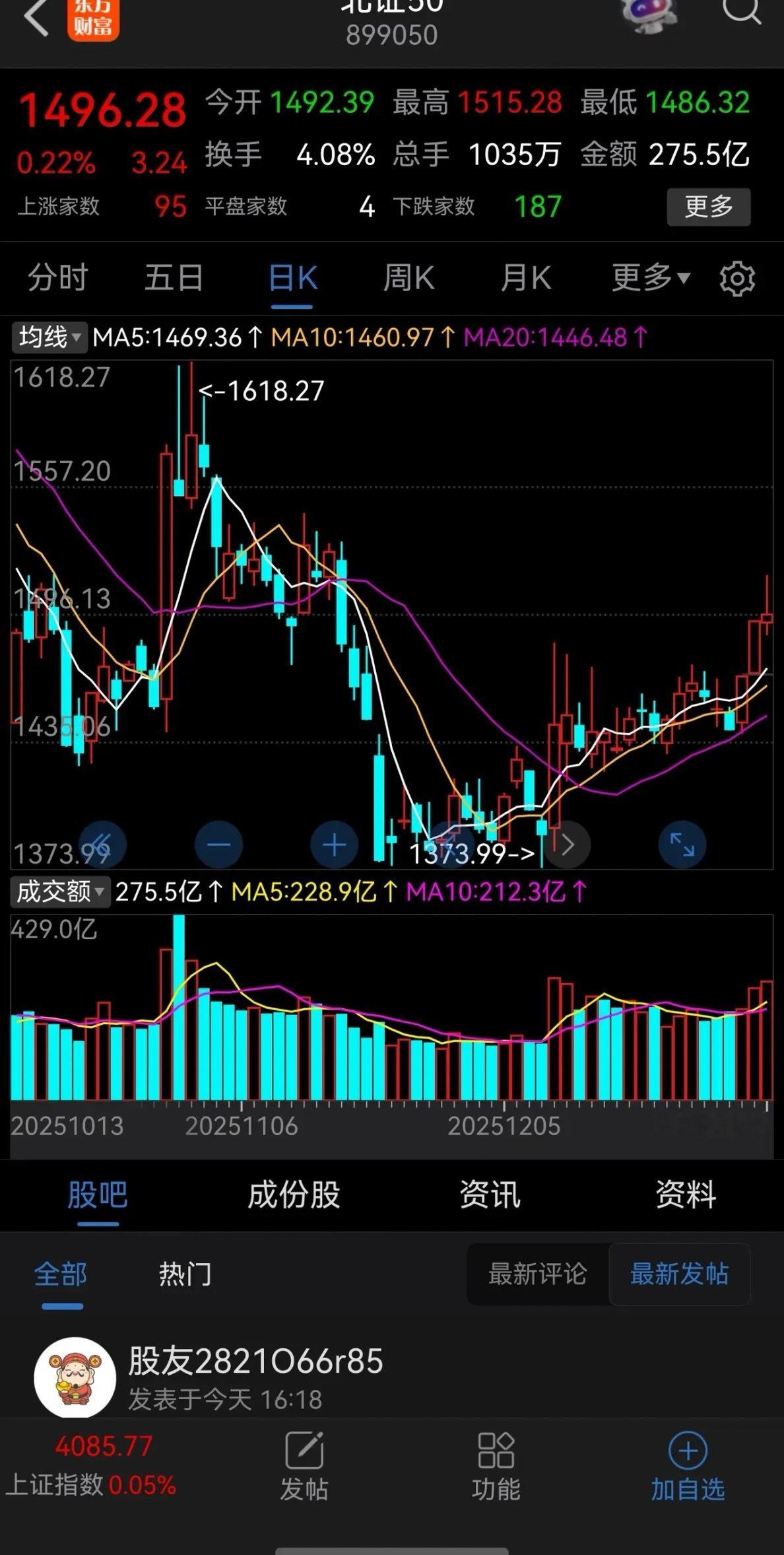 今天上证指数和北证50指数都收出了阳十字星,创业板指数收出了阴十字星。上证指数是