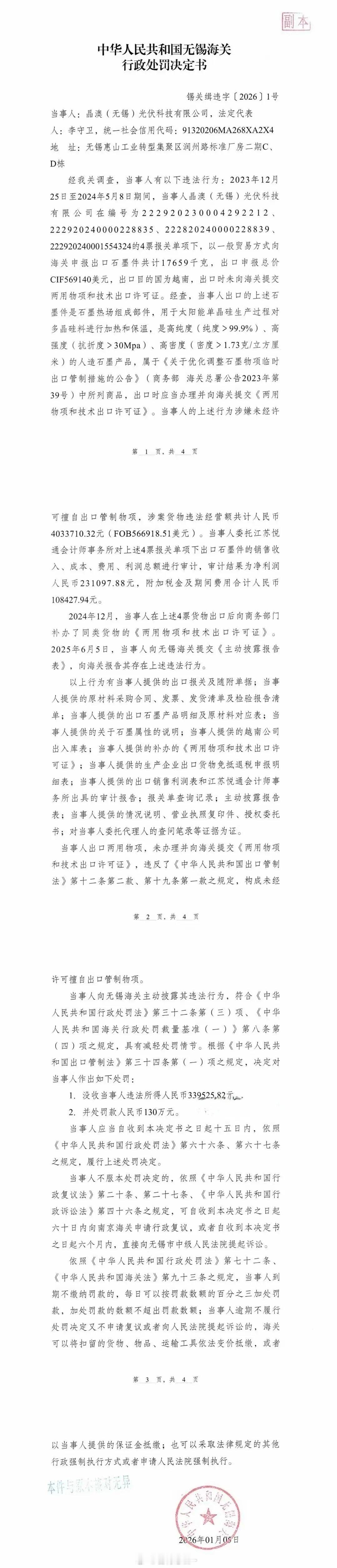 擅自出口管制物项被罚163万,第一罚单砸向晶澳!无锡海关发布的锡关缉字[2026]1号行政处罚决定书显示,这家光伏巨头因未经许可擅自出口管制物项,被没收违法所得33.95万元,再加130万元罚款,合计超163万的罚没款!作为光伏行业的头部企业,晶澳不可能不清楚出口管制的红线。这类物项关乎国家产业安全和技术壁垒,不是想卖就卖的“普通商品”。可偏偏敢铤而走险,说到底还是抱着行业巨头没人敢查的侥幸,把合规当摆设,把国家规则当可有可无的条条框框。光伏产业是中国出海的“金名片”,靠着技术和产能优势在全球市场站稳脚跟,但这绝不代表企业能仗着行业优势无视监管。不管是行业龙头还是中小企业,不管是新年开局还是平日经营,碰了出口管制的红线,就必然被依法追责,没有任何例外!163万的罚没款对晶澳或许只是皮毛损失,但这份2026年海关1号罚单留下的合规污点,却会跟着企业的进出口信用记录走。出海挣外汇的底气,是技术和产品,更是对国家规则的敬畏。揣着侥幸闯红线,最终只会砸了自己的招牌!