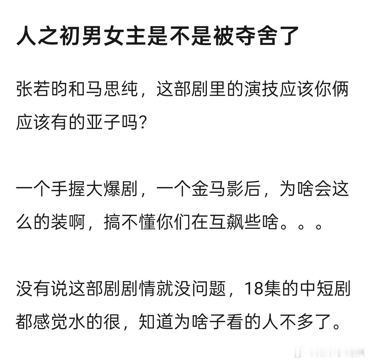 张若昀 马思纯的《人之初》终于要超点抬走了…可能是整个故事就一般且单薄,编导却要展示自己的艺术“追求”,还要有对“人性”的思考,螺蛳壳里做道场,要看自己有没有那种本事的。电视剧观众越来越少的当下,真的还适合“炫技”吗?男女主一个手握大爆剧,一个金马影后,为啥会这么的装啊,搞不懂你们在互飙些啥…演技尴尬的完全没有代入感😓就这种剧天天营x个没完,粉丝一句扑就当没播过,主演是不是还真信了