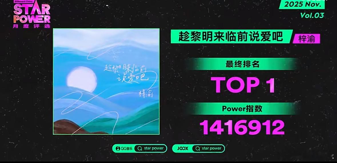 Star Power月度评选11月榜单,梓渝《趁着黎明来临前说爱吧》登上top1,恭喜青年歌手梓渝,真的好听!