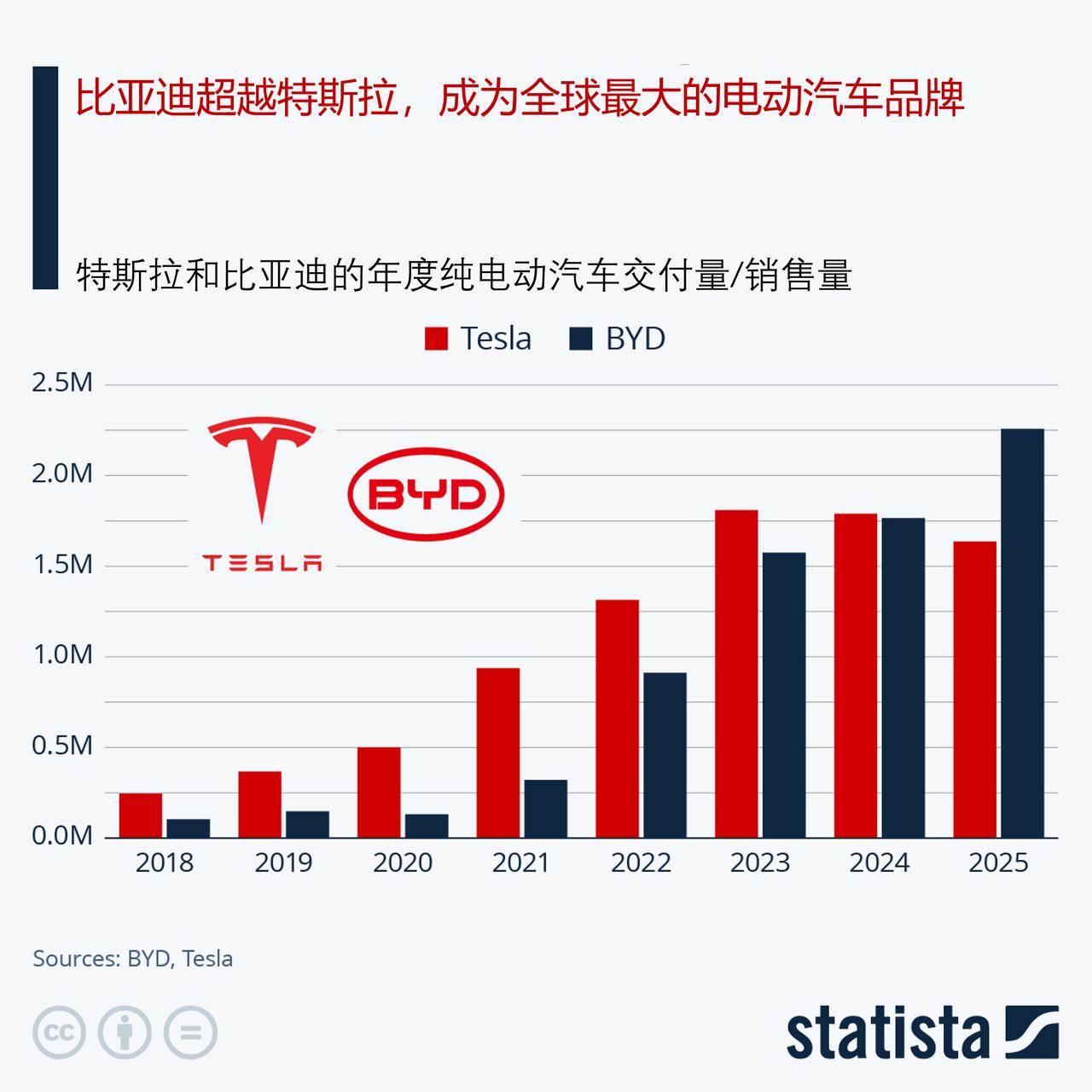 比亚迪的新能源革命使其超越特斯拉,成为全球领先的电动汽车品牌 或许没有哪个例子能更好地体现中国向电动化转型的迅猛步伐,那就是比亚迪。凭借其作为电池制造商的经验,该公司成功地从内燃机汽车转型到了中国的“新能源汽车”领域,即纯电动汽车和插电式混合动力汽车。正如下面的图表所示,该公司以惊人的速度实现了这一转变,其电动汽车的产量增长速度之快,就连欧洲或美国的传统汽车制造商都只能望尘莫及。 自 2018 年以来,比亚迪将电动乘用车的年销量从略高于 20 万辆提升至 2025 年的超过 450 万辆,同时逐步停止生产汽油动力汽车,最后一款汽油动力汽车于 2022 年 3 月下线。考虑到这一停产举措,比亚迪在 2023 年超越大众成为中国最畅销的汽车品牌这一点就显得更加令人瞩目,并且此后一直保持着这一领先地位。 2025 年 12 月,比亚迪庆祝其生产了第 1500 万辆新能源汽车。而该公司在 2008 年首次推出大规模量产的插电式混合动力汽车后,用了 17 年才达到这一里程碑。在生产 100 万辆汽车耗时 13 年之后,此次从 100 万辆跃升至 1500 万辆新能源汽车仅用了 13 个月。2025 年,该公司售出了 450 万辆新能源汽车,其中近一半是纯电动汽车,另一半是插电式混合动力汽车。 在多年占据全球电动汽车市场领先地位之后,特斯拉已将世界领先的电动汽车品牌头衔让给了中国巨头比亚迪。在 2024 年其电动汽车产量已略超特斯拉之后,比亚迪在销量方面去年更是超越了特斯拉,而由埃隆·马斯克领导的美国公司则连续第二年出现年度销售下滑。尽管比亚迪的全球电动汽车销量在 2025 年增长了 28%,达到 226 万辆,但特斯拉的交付量却下降了近 10%,降至 164 万辆,因为电动汽车税收抵免的取消以及马斯克引发的分裂性政治活动损害了特斯拉的销售业绩。欧洲人尤其不再钟情于这个曾被视为进步象征的品牌,特斯拉在 2025 年前 11 个月在欧盟的销量下降了近 40%。与此同时,比亚迪继续在欧洲市场取得进展,其在欧盟的销量较 2024 年增长了两倍多。 就在几年前,中国以外的大多数人还未曾听说过比亚迪。但这家总部位于深圳的电子及制造巨头近年来却声名远扬,其最大的业务部门/子公司比亚迪汽车已成为全球最大的电动汽车制造商之一,并成功拓展到了本土市场之外的领域。比亚迪成功地从内燃机汽车转型到了中国 “新能源汽车”领域。该公司以惊人的速度实现了这一转变,其电动汽车的产量增长速度之快,在此前只有特斯拉能达到。