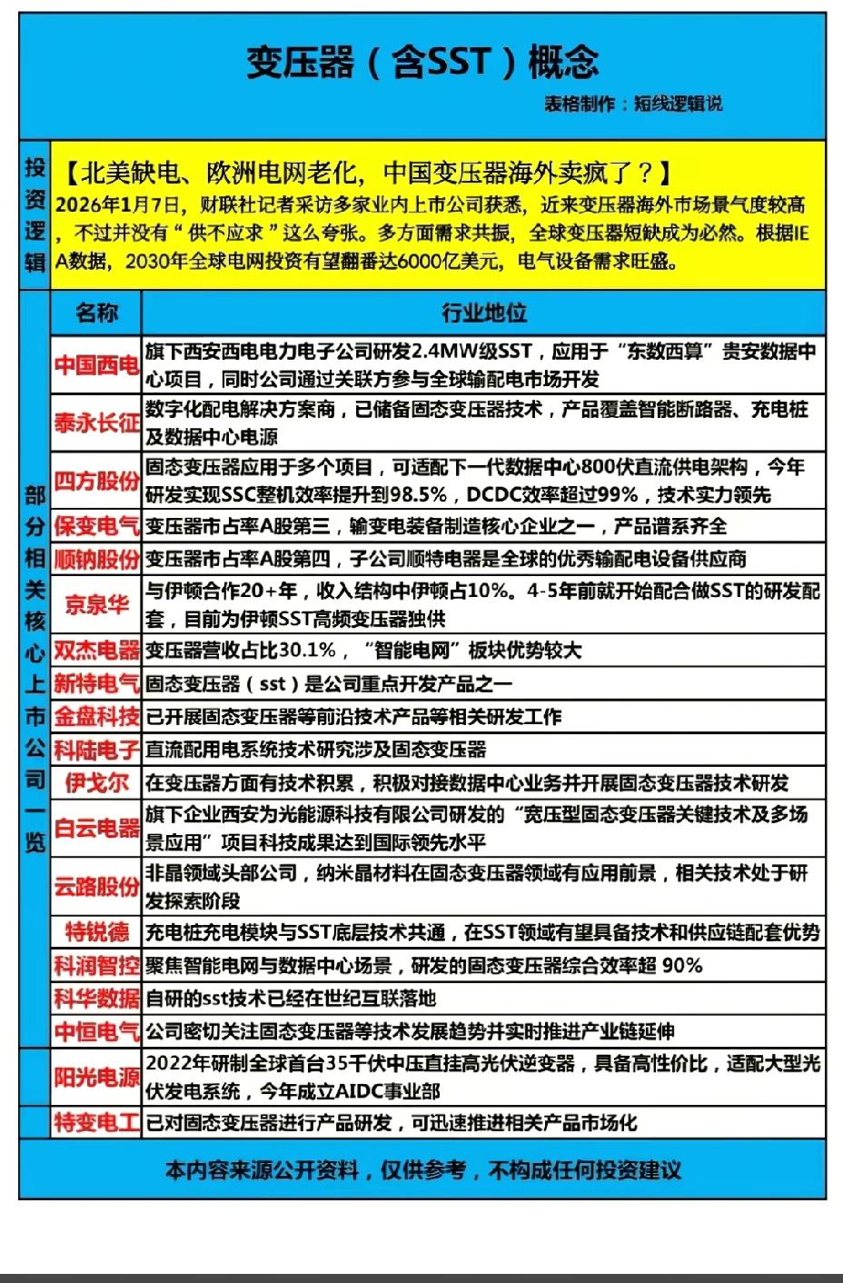 1月8日,周四A股这个板块有望大涨!!! 北美缺电,欧洲电网老化,变压器国外市场景气度较高,预计2030年 ,全球电网投资有望翻番达6000亿美元,电气设备需求旺盛,重点关注:泰永长征、长征电气、科华数据!!!