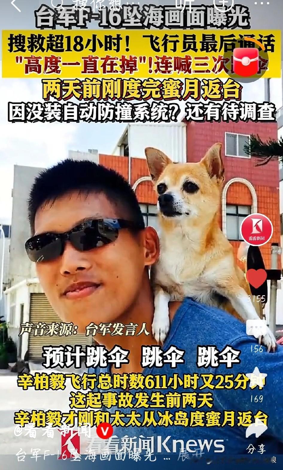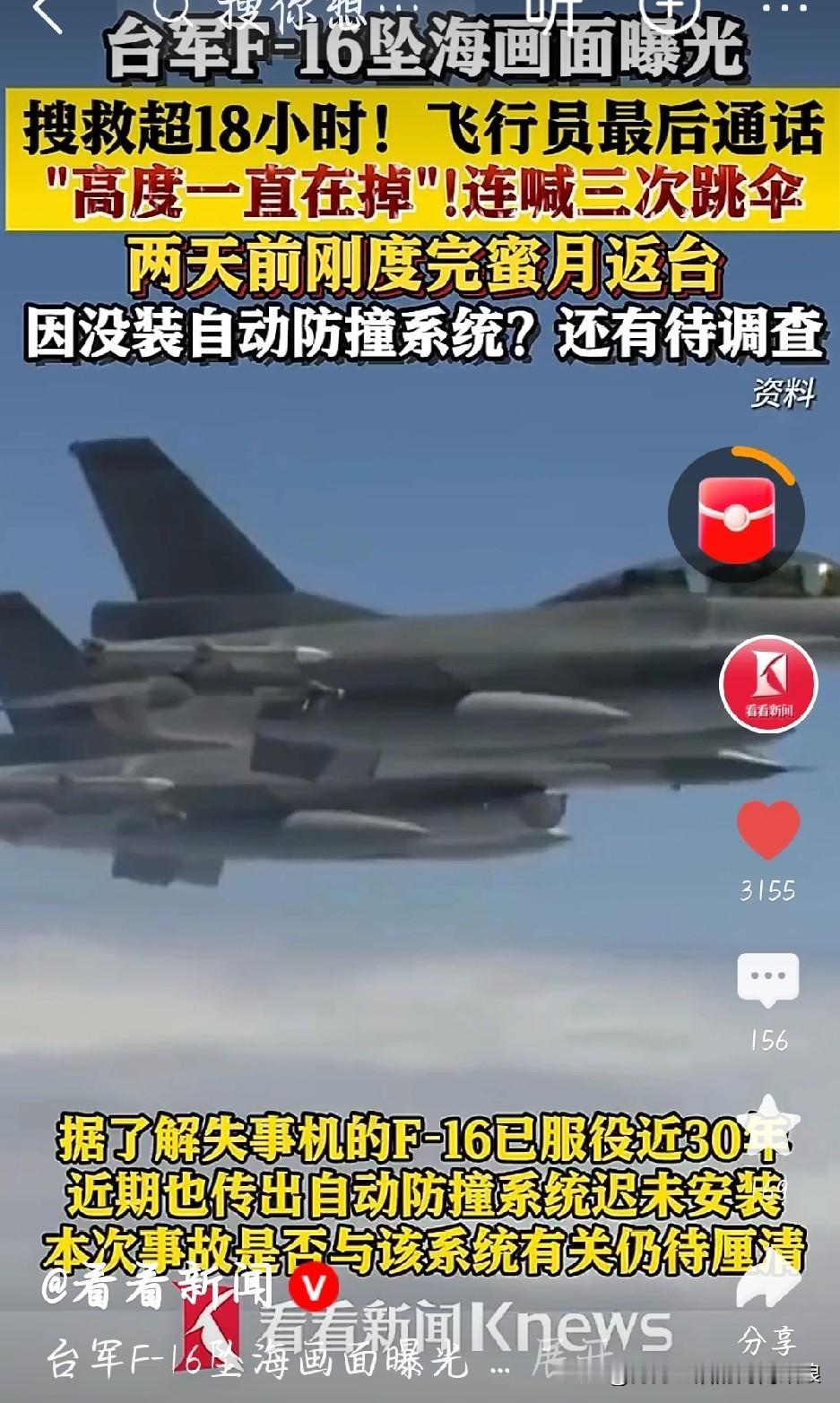 台军F16坠海,飞行员最后3声“跳伞”听着心疼! 台军F16坠海的最后通话曝光,真的让人心里一揪。 飞行员刚度完蜜月归队两天,夜训时突然喊“高度一直掉”,接着连喊三次“跳伞”,一分钟后雷达信号就没了。现在搜救了这么久,还是没找到人,他的妻子在基地外崩溃发呆,看着都难受。 可这不是第一次了!台军的F16都摔了11架,10条人命没了。说好装的自动防撞系统,2026年了还没到位,飞行员的防寒服也迟迟不采购。战机是二手的,零件贵得离谱,钱全给美国送出去了,却不管自家飞行员的死活。 说白了,这哪里是训练事故,分明是“以武谋独”害的!把年轻人的命,当成买美国武器的筹码,当成分裂的赌注,太荒唐了。 和平不在军火库里,在祖国怀抱里。别再让更多家庭破碎了!台军F16坠海飞行员最后通话曝光, f-16c战机 一提到台湾你会想到什么 美国f16战机 图片截图于看看新闻