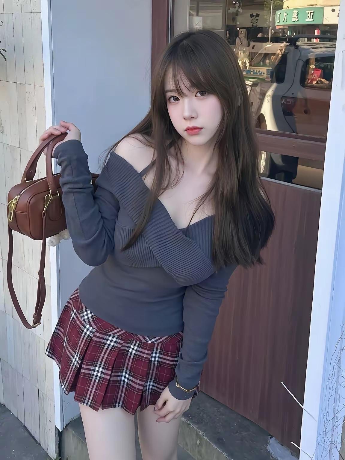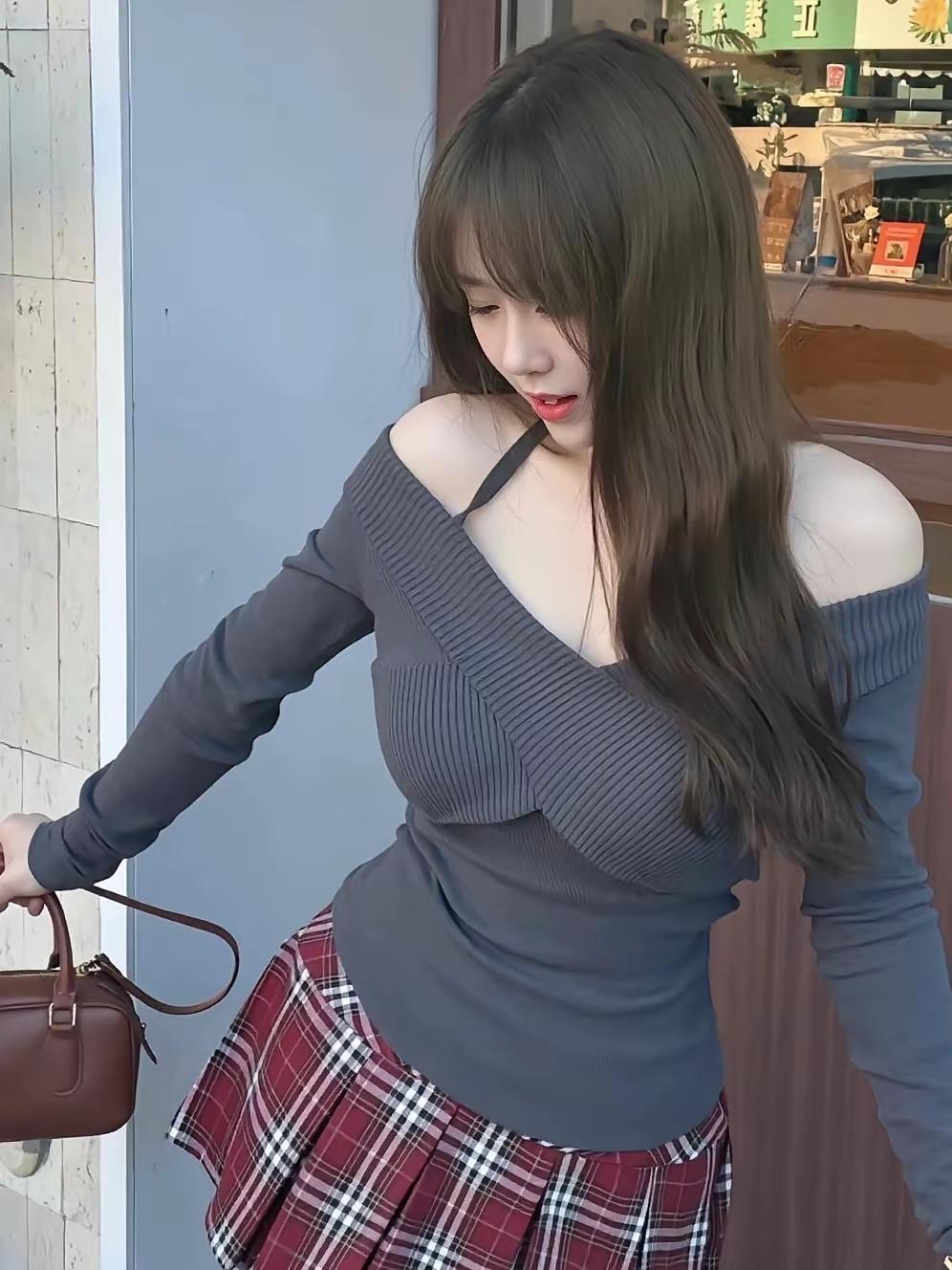 肉肉女生也能驾驭甜酷辣妹风!深灰色露肩针织衫自带修身效果,斜肩设计巧妙露出锁骨,弱化上半身肉肉感;红上半身肉肉感;红格百褶裙拉高腰线,蓬蓬的裙摆还能遮住胯部和大腿肉肉,搭配复古小挎包,甜辣氛围感直接拉满~