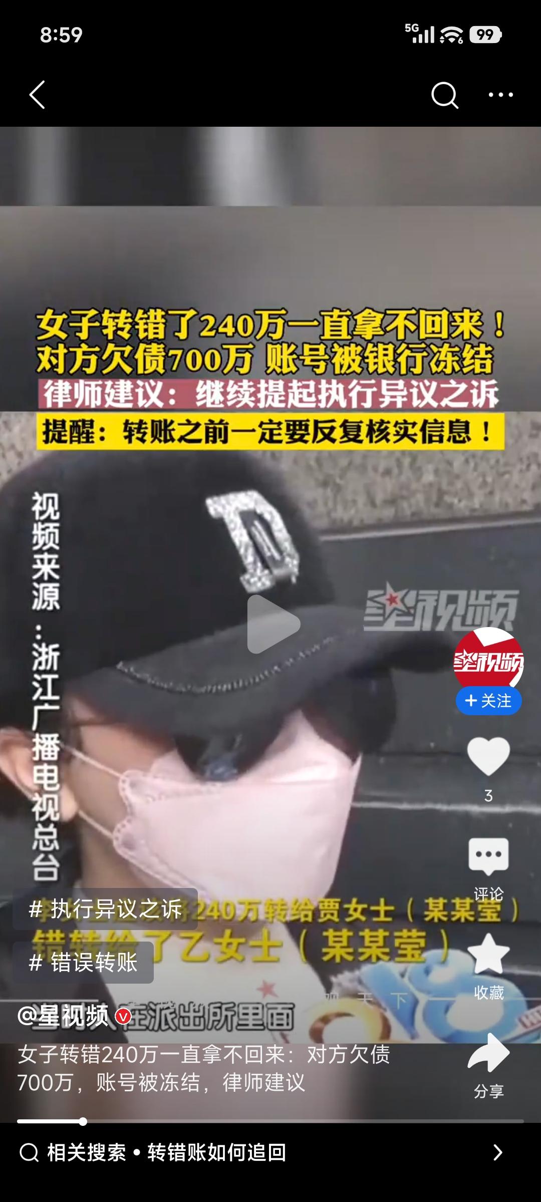 浙江宁波的李女士太倒霉了!去年12月26日,她本想帮朋友还款,结果误把240万转给了一个负债700万的熟人。转错后她赶紧联系银行、警方,还起诉了收款方。今年2月法院判收款方返还,但对方账户早被多家法院查封冻结。 更惨的是,240万里有87.4万已被鄞州法院划扣去还另案债务,剩余款项也冻结着。李女士提执行异议还被驳回,因为法院执行顺位在她之前。目前案件还在审理,律师建议她继续提执行异议之诉。这事儿给咱提了个醒,转账时可得反复审核,不然损失可就大了。