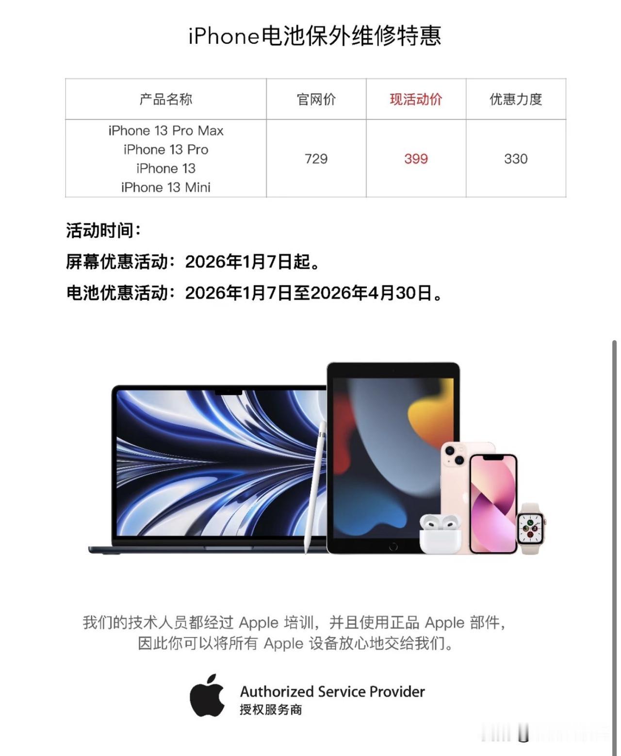 1 月 7 日到 4 月 30 日,更换电池服务原价 729 元,限时 399 元,包含 iPhone 13、13 mini、 13 Pro 和 13 Pro Max 四款机型。不过注意,是酷动、天音、直信创邺这种授权服务商才能半价,直营售后依旧是原价 729。 我的 iPhone 14 Pro Max 电池也不行了,啥时候给 iPhone 14 系列也来个半价换电池?[吐舌]