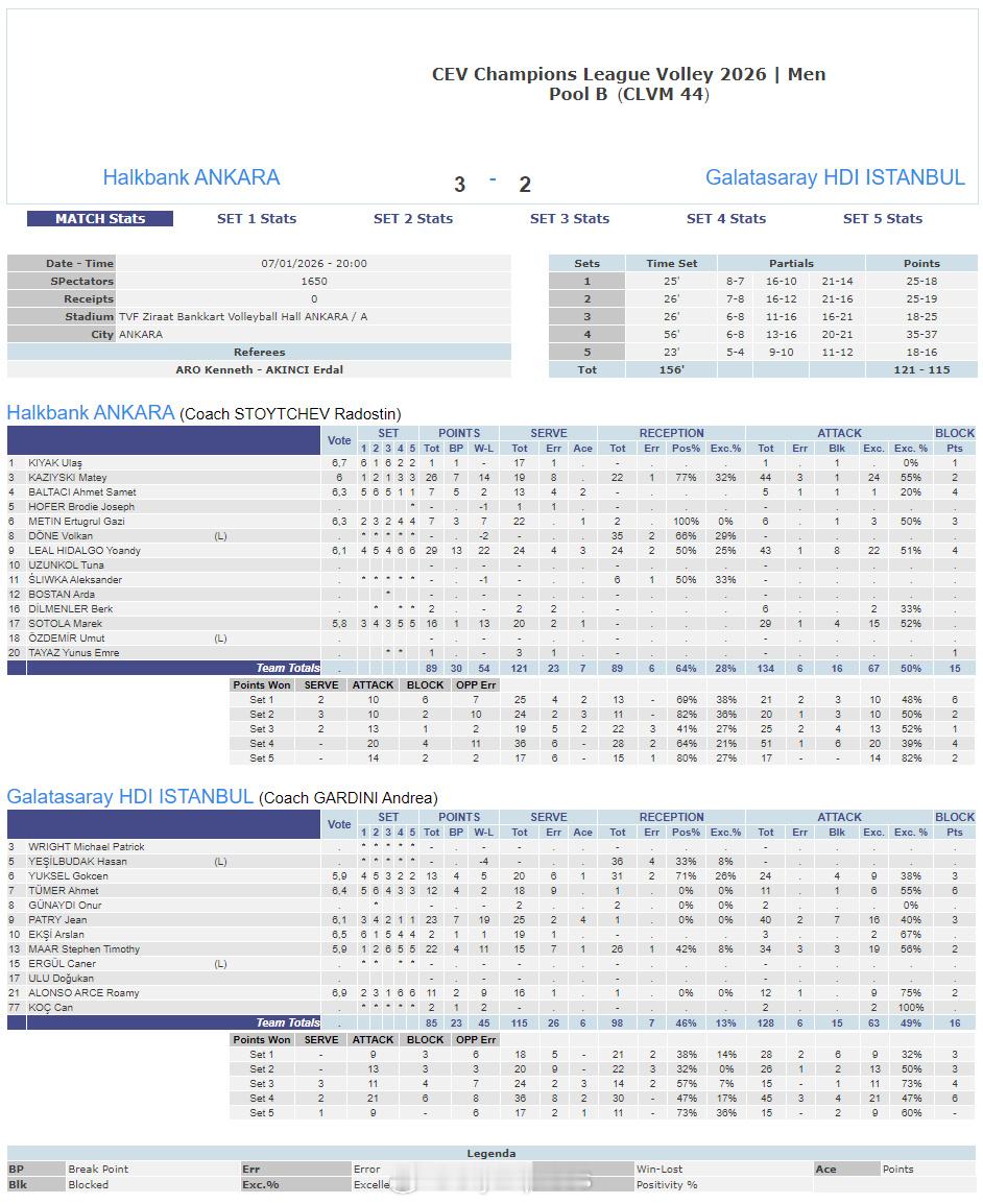 【欧冠男排佩鲁贾3-2苦胜拉斯帕尔马斯 浩克银行156分钟五局险胜加拉塔塞雷】国际排坛战报速递1月7日,欧冠男排第四轮第二回合,C组意大利佩鲁贾客场经过2小时21分钟苦战,才以3-2(25-23/25-20/22-25/16-25/15-10)艰难战胜西班牙拉斯帕尔马斯,取得两连胜。MVP本塔拉22分、索尔17分、石川祐希16分,贝泽拉-索萨23分、胡安托雷纳15分、罗塞克斯和拉莫斯各14分。B组土耳其德比战,浩克银行主场鏖战156分钟,3-2(25-18/25-19/18-25/35-37/18-16)险胜加拉塔塞雷。MVP里尔29分、卡兹伊斯基26分、索托拉16分,帕特里23分、马尔22分、尤克塞尔13分、图莫尔12分、阿隆索11分。