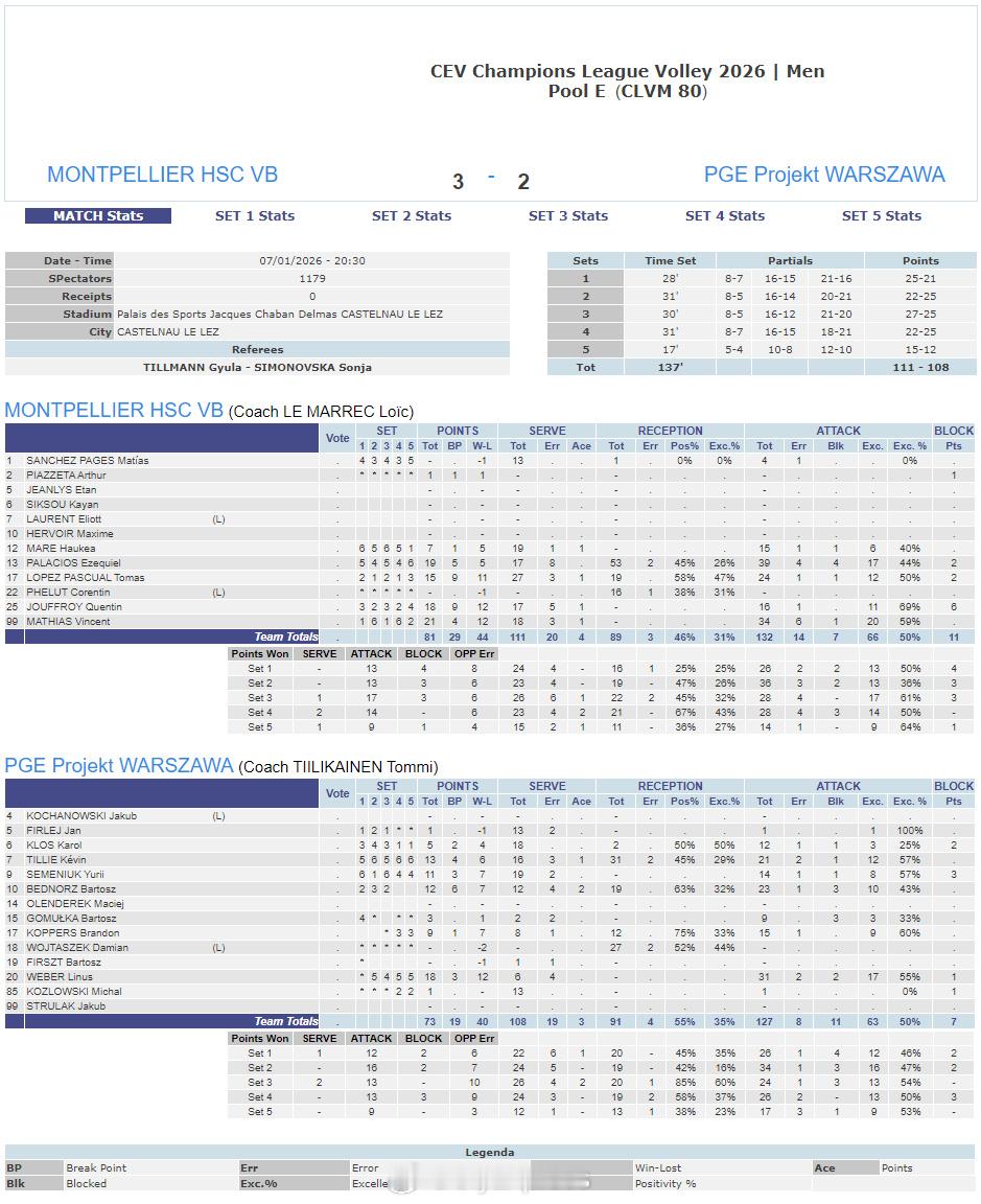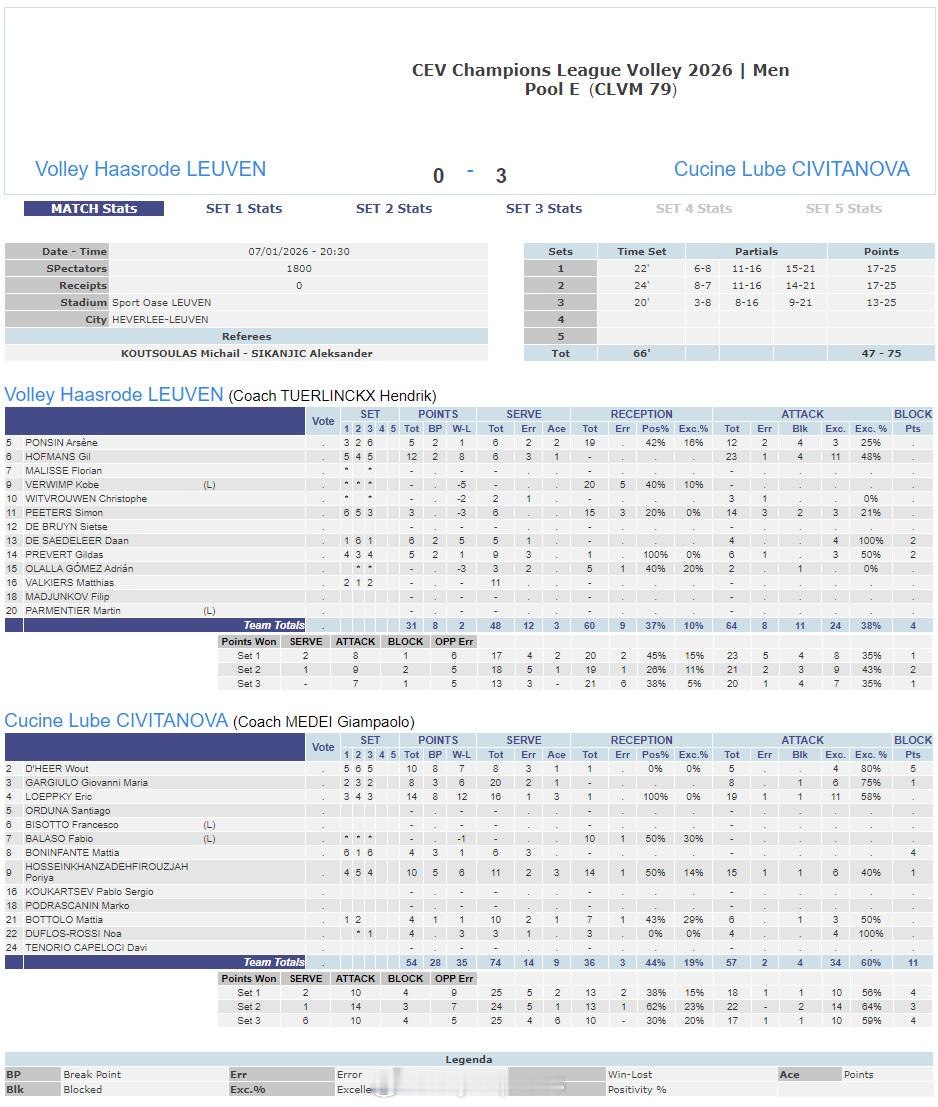 【欧冠男排鲁贝3-0轻取鲁汶 华沙2-3败走蒙彼利埃】国际排坛战报速递1月7日,欧冠男排第四轮第二回合,E组意大利奇维塔诺瓦客场3-0(25-17/25-17/25-13)轻取比利时鲁汶,取得两连胜。MVP洛普基14分、德赫尔和波利亚各10分,霍夫曼斯12分。波兰华沙客场2-3(21-25/25-22/25-27/25-22/12-15)败走法国蒙彼利埃,韦伯18分、蒂略13分、贝德诺兹12分、Y-塞曼纽克11分,马蒂亚斯21分、帕拉西奥斯19分、乔福罗伊18分、MVP洛佩兹-帕斯奎尔15分。