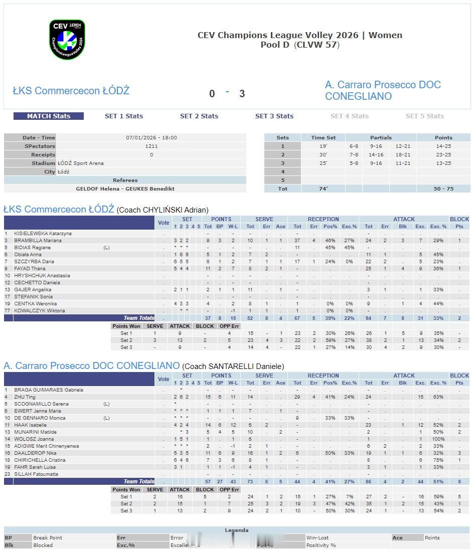 【欧冠女排科内横扫罗兹LKS MVP朱婷15分冠全场】中国排球留洋动态朱婷欧冠15分获MVP1月7日波兰罗兹,欧冠女排第四轮第三回合,意大利科内利亚诺客场3-0(25-14/25-23/25-13)横扫波兰罗兹LKS,取得三连胜。朱婷得到全场最高的15分荣膺MVP,其中24扣15中,哈克14分、达尔德罗普11分,主队菲亚德11分。