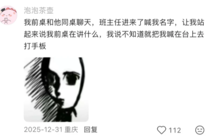 我前桌和他同桌聊天,班主任进来了喊我名字,让我站起来说我前桌在讲什么,我说不知道就把我喊在台上去打手板