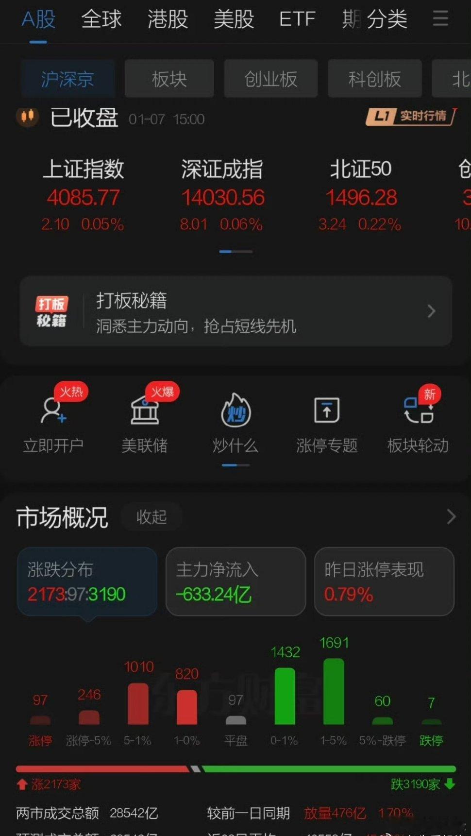 1月7日收盘点评 周三港股单边下跌影响A股大幅开始震荡等均线,上证14连阳继续刷新记录,成交变化不大依旧是高量区间,有量就没事继续看好热点轮转,今日下跌家数较多但都属于强势震荡等均线,明日可能再震荡一天但应冲击4100点谨防回落不追高,后市若金融权重继续发力仍有上攻机会,看涨期权依旧强势,全球股市狂飙后年初较好的时间周期正在显现没有明显拐点icon时可继续看多做多。热点上科技股领域存储芯片icon光刻胶半导体均有利好支撑继续撑盘,新能源和有色金属在商品期货强势下休息一天,煤炭期货涨停煤炭股超跌反弹,机器人受特斯拉icon下跌故意打压,技术形态还在平复中,开年炒马斯克icon概念,机器人是最终破局领域继续看好,脑机接口和商业航天分化较大依旧强势虹吸icon资金,今日轮到可控核聚变上攻有消息刺激,创新药见底后稳步回升,尾盘CPO概念带领英伟达icon和谷歌icon反弹,PCB上下游和电源领域反弹活跃,说明主流热点并未结束,三大指数均创新高,创业板有补涨要求,继续看好后市,重个股轻指数把视野放长,随着盘面走高K线组合运行中更加复杂坚持做好逢低布局做好差价节奏。