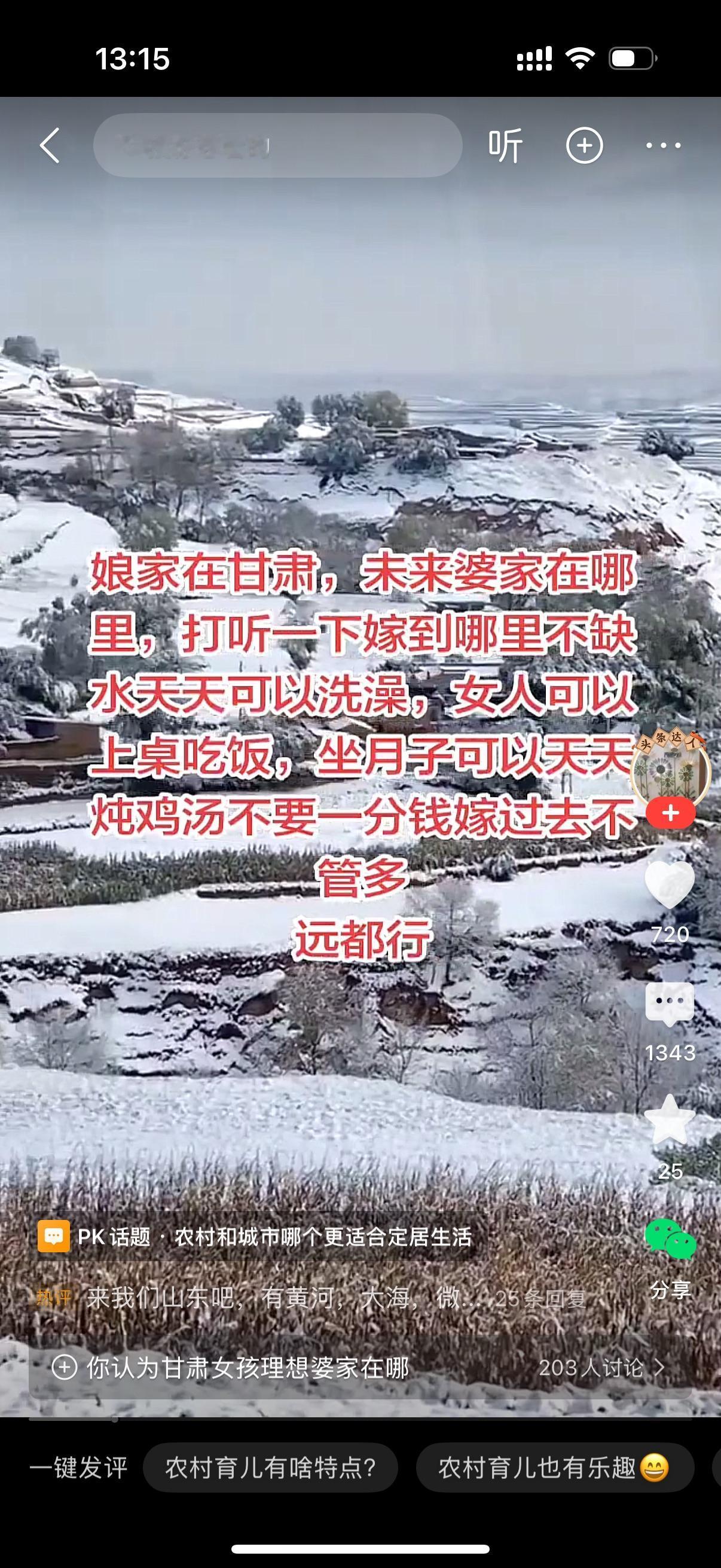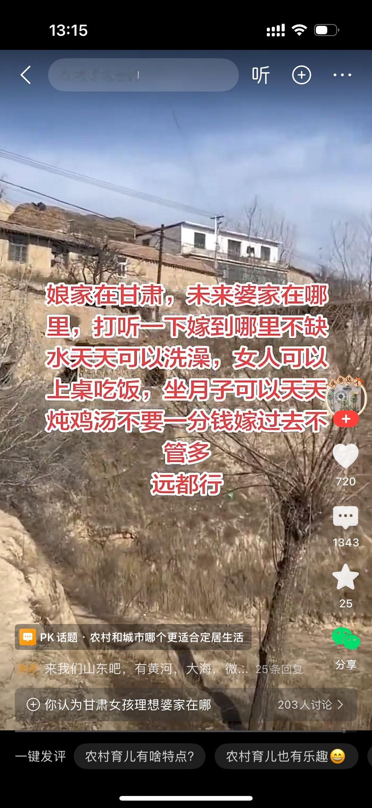 甘肃女人在网上求嫁。她说自己是甘肃人,问未来婆家在哪里?只要那个地方不缺水,可以天天洗澡,女人可以上桌吃饭,坐月子可以顿顿喝鸡汤,不要一分钱就嫁过去,不管有多远。说真的,真没有想到甘肃的生存环境居然这么艰难,居然缺水,女人还不能上桌吃饭。