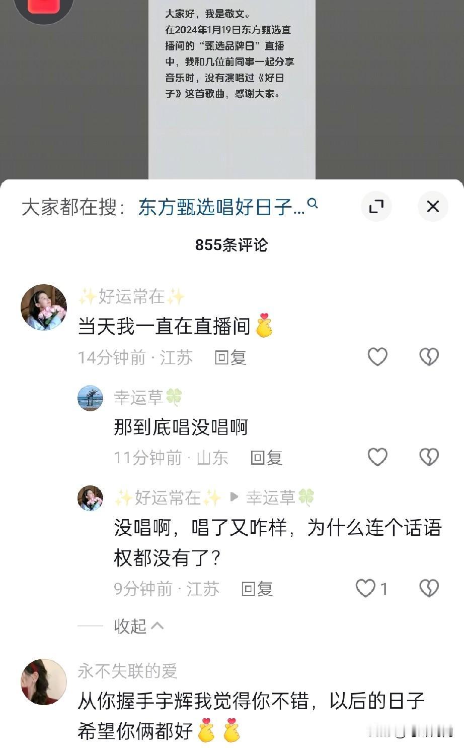 敬文你说你凑啥热闹,谁也没说你啥,整滴地就像董宇辉现在很在乎你们的解释,你们真的想多了。 你的评论区,以前的同事还给你证明,说你没唱。 你当时留在东方,站在那个地盘上,唱不唱“好日子”,有啥不同,毕竟拿人家的工资,唱了也正常。 但是,两年多了,你看见YOYO道歉,你也来个解释,真的很没劲,有点掉身价。 董宇辉完全不在乎你们这些操作的,难道那些人还要排着队道歉吗?那也只能是我们这些吃瓜网友,对你们评头论足一下。 董宇辉可没时间理会你们,就像有个大姐说的,地上麻雀“喳喳”叫几声,天上的雄鹰是听不见的,已经是不同阶层,天地之差了。 拜托了,不要再出来一个解释的,会忙坏这些吃瓜的粉丝。哈哈。