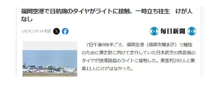 日本航空的波音787客机最近碰撞事故频发啊。当地时间1月7日21时30分许,在日本福冈机场,一架飞往东京羽田机场的JL332航班,起飞前沿滑行道行驶时,轮胎和滑行道旁助航灯撞了。机上约290名乘客和11名机组人员,好在无人受伤。飞机前侧轮胎与助航灯接触后,停留约1小时返回停机位,航班也取消了。 而在当地时间5日,美国西雅图塔科马国际机场,一架日本航空波音787 - 9型客机降落滑行时,右翼和达美航空波音737 - 800型客机尾部碰撞,同样无人受伤,但影响了机场航班降落。日本航空这是咋回事,得好好重视安全问题了。