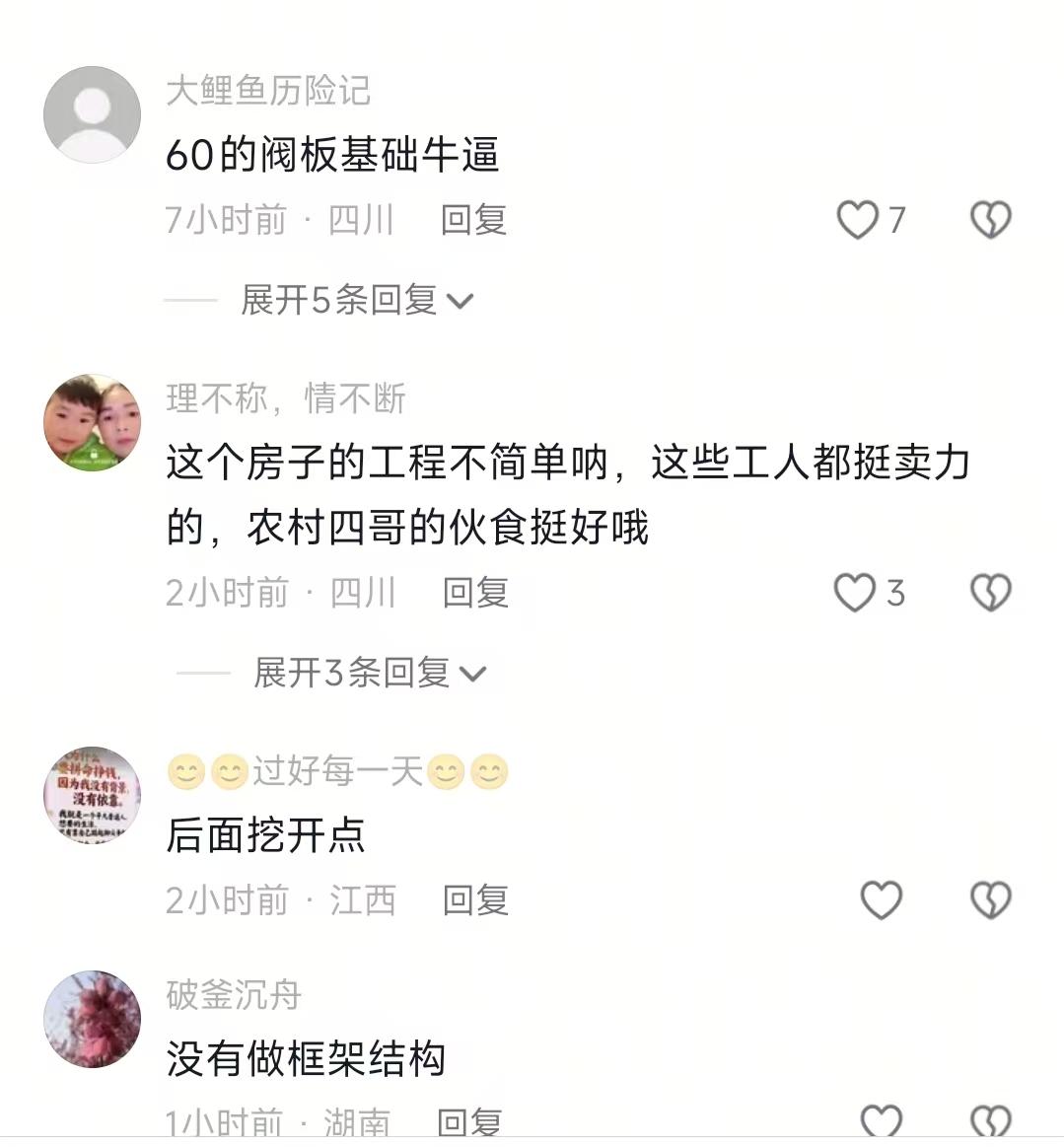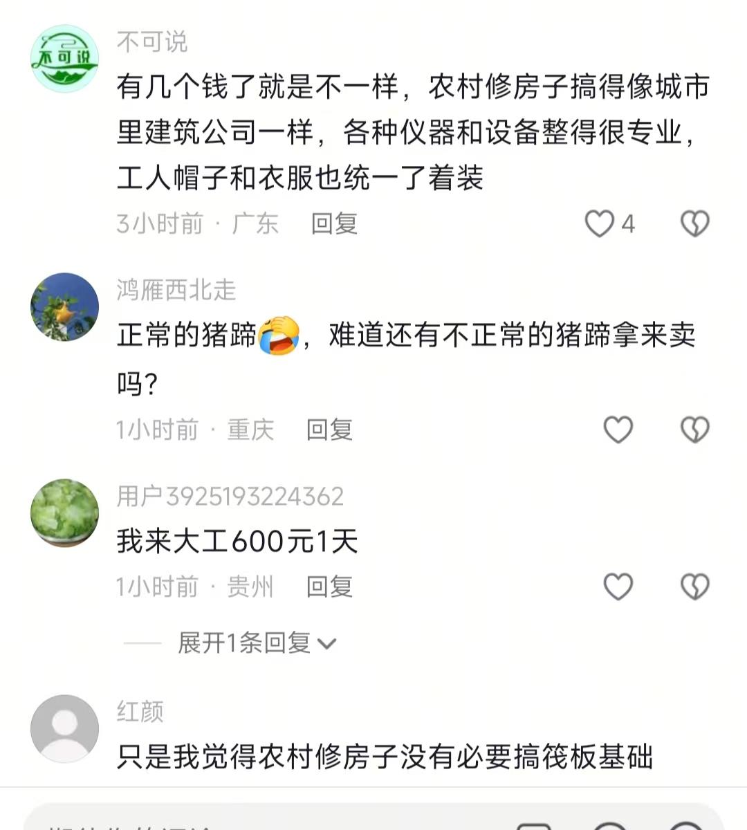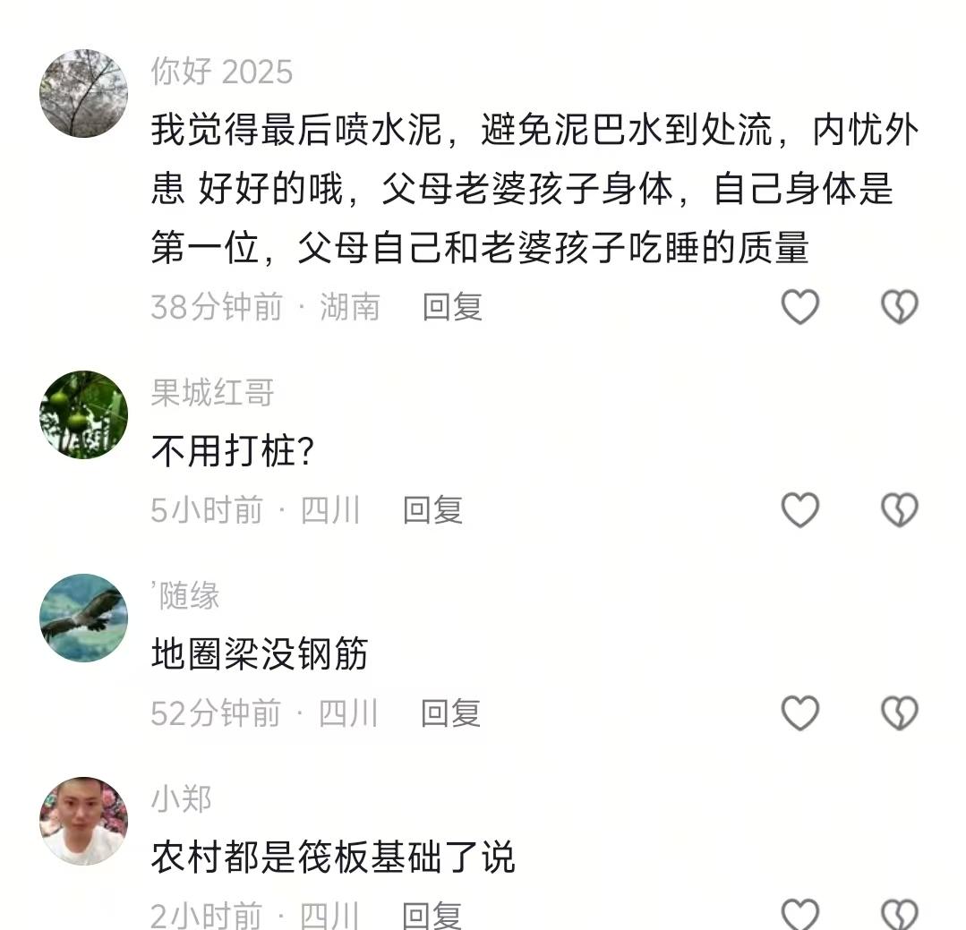 看到农村四哥介绍建房的进度,我忍了 看到他说,墙体定60公分,每两三米立根大柱子,我也忍了 可是看到要沿用他爸40年前的老地基我实在忍不住了 说真的,现在农村自建房能把人搞到崩溃,要么地质不行白砸钱,要么工人磨洋工进度龟速,我晕,谁懂这种痛!我刷到农村四哥的工地视频,直接直呼太接地气。四哥站在工地里咔咔讲流程,墙体定60公分,每两三米立根大柱子,地基先做防水再铺钢筋浇混凝土,一套操作行云流水。本来我想吐槽他咋不按常规打坑,结果四哥一句话点透,当地地质全是沙石,挖再深也是白搭,不如沿用他爸40年前的老地基。我想起去年邻居跟风打坑,挖三米全是碎石,最后只能回填,钱花了不少还耽误工期,郁闷到不行。 工人是真给力,早上七点就到工地搬砖砌墙,那速度跟开了倍速似的。四哥说工人干工人的活,他的活就是搞伙食,这话没毛病!本来我以为他会随便煮点青菜应付一下,结果看到工人汗珠子掉地上摔八瓣,他立马转身进厨房大显身手。腊猪蹄切块过水,黄豆泡得圆滚滚,然后一起下锅炖,香味直接飘出二里地。中午工人围坐干饭,那场面,太棒了!旁边路过的大叔搭话:“这就是种啥因得啥果,你对人家掏心窝,人家才肯给你下死力。”我和小伙伴聊起这段,俩人都惊呆了,这话听着糙,理是真不糙啊。 不是吧?视频评论区直接炸开锅!有人说四哥家进度比渝乡桃子家快太多,必须的!有人夸工人卖力伙食也好,也有人哐哐发问,咋不打防震柱?还扒出2019年四川地震的事儿,担心房子抗震性。更有人直言农村自建房搞筏板基础纯属胡扯,还有人点赞说这是按抗八级地震标准来的。说实话,争议点就俩:进度快了会不会牺牲质量?老地基+不打坑到底符不符合抗震要求?我觉得吧,自建房真不能盲目跟风,先摸清自家地盘的地质情况比啥都重要,而且对工人好点准没错,人家吃好喝好,干活才会更上心! 总之,农村四哥建房的进度是可以了,明年过年前就可以住的,真的希望能顺利完成,看看建成后是怎么样的,你觉得呢?