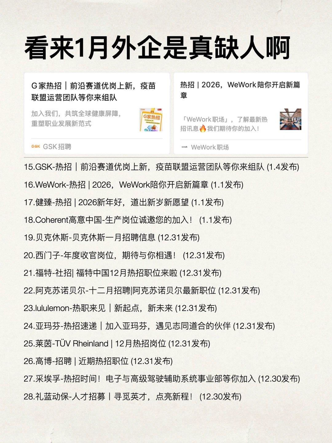 2026开年才没几天,但外企放hc的速度就格外的快,图上就把最近的一批给大家列出来了 过年前这波可以说是捡漏的最好机会了,甚至还有在急招的,找工作的都去试试,特别是空窗期的,外企对空窗期的人很友好 🤔除了机会多,其实外企的“香”才是最吸引人的 WLB (work-life balance)、早9晚6,双休,无966、女性友好、年假10多天起步、灵活居家办公、福利齐全、氛围轻松,外企是很多人的情司,相对来说,外企确实非常的神仙 图上就把最近新开的详细名单都列了出来,感兴趣的可以投起来了 坚持日更✊🏻,对外企感兴趣的欢迎常来看看