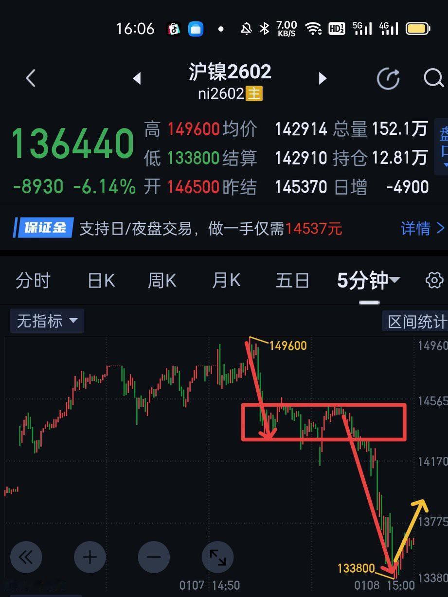 沪镍2602,首先承认个错误。昨天夜盘前提示要防止围绕一分钟中枢会出现背驰,并设好143860的止盈后,又犯了主观预测的毛病,自认为三十分钟线段结构没问题,回调幅度应该不会太大,不适合开空单。结果今天空头大杀四方。以后一定要遵从结构,杜绝主观臆断。目前沪镍三十分钟一笔下仍未呈现结束迹象,夜盘可观察围绕图〈2〉的一分钟中枢是否形成三卖点,如果三卖形成,三十分钟下仍会继续生长,节奏上仍以空单为主。直到形成第二个一分钟中枢后产生背驰,或5分钟的线段下出现明显衰竭,再考虑多单的操作。如果没形成三卖,可等五分钟一笔回调不创新低或五分钟回调出现明显衰竭,再入场做多。