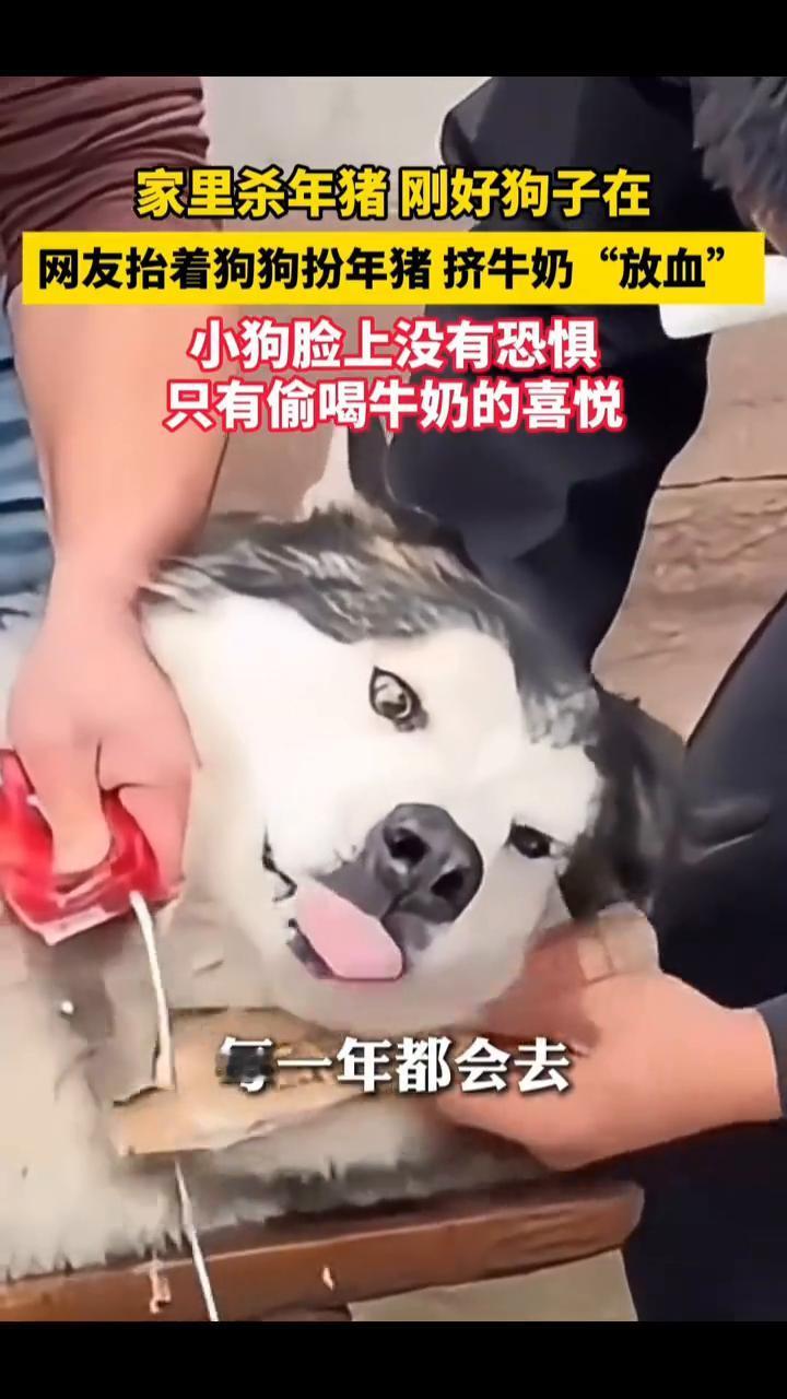 年猪刚好狗子在,网友抬着狗狗扮年猪挤牛奶"放血",小狗脸上没有恐惧,只有偷喝牛奶的喜悦。 美丽浙江采访犬主陈先生:那天家里杀猪觉得好玩,就让狗子体验了一下。我们家的狗狗是阿拉斯加,它已经六岁了,每一年都会去做一点类似的事情,有好玩的东西,狗狗一定要体验,可以吃的都会给它吃。