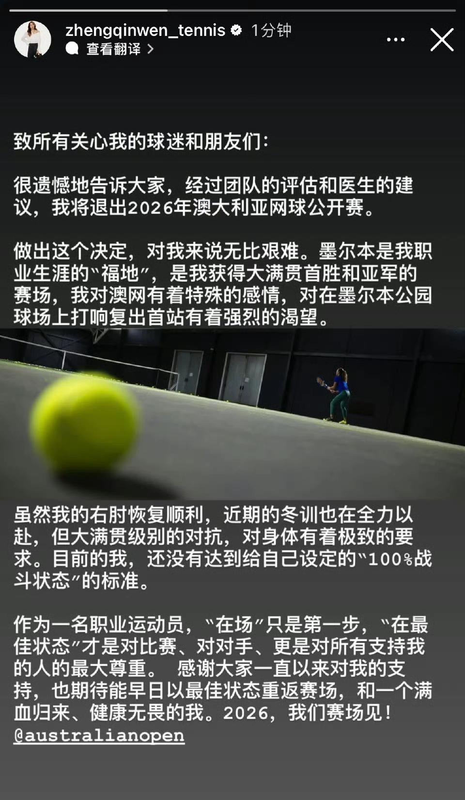 网球人的天都塌了!当初为什么要急于参加中网?淘米的人设呢……没想到2024澳网竟然是她的职业生涯顶峰。 郑钦文宣布退出2026澳网。她说右手肘恢复顺利,但还不足以100%参加大满贯比赛。