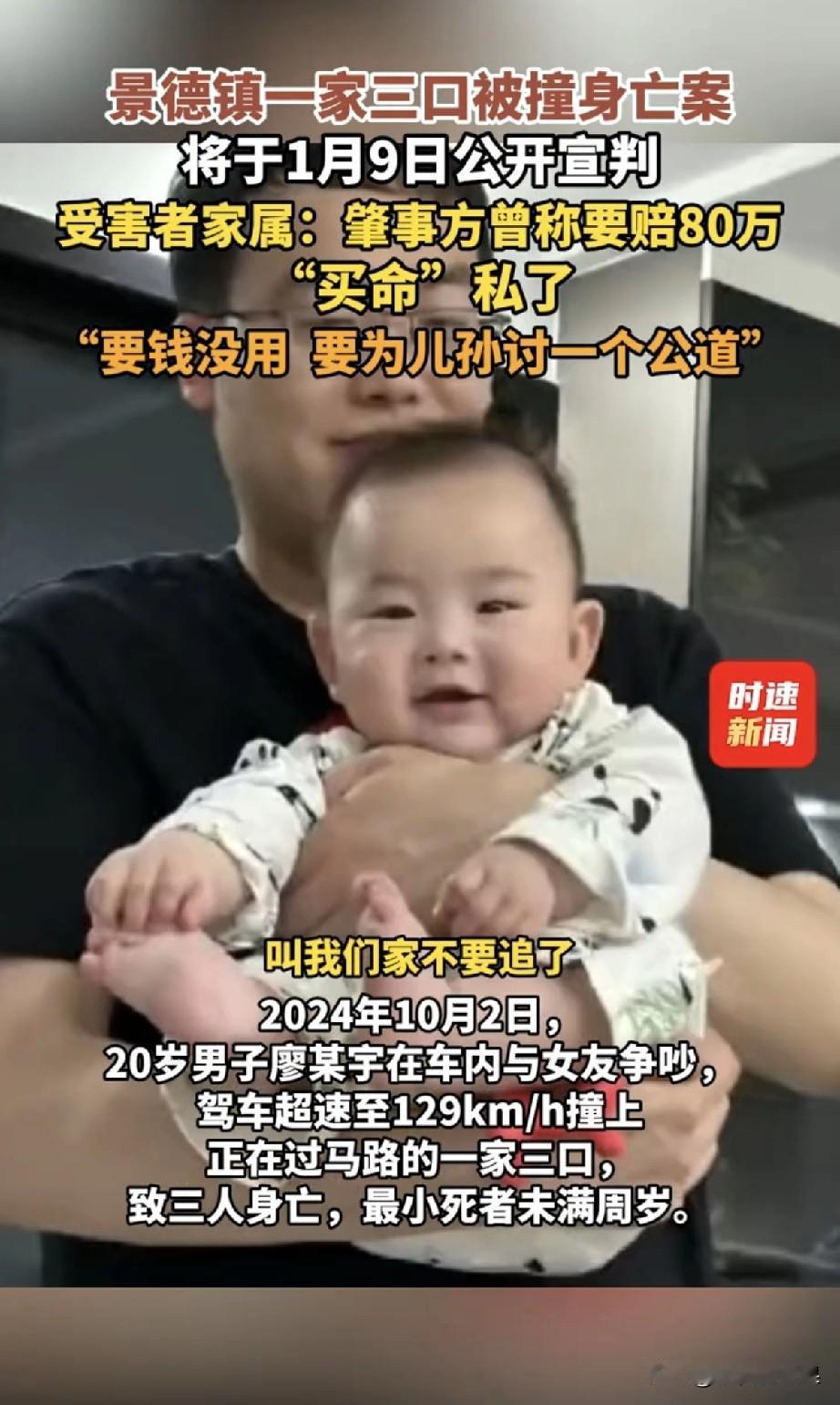 景德镇一家三口惨死案终于要判了!1月9日公开宣判,想想都让人揪心。 2024年10月2日,20岁廖某宇和女友吵架,限速40的路飙到129km/h,直接撞死过马路的一家三口,最小的宝宝还没满周岁。 更气的是,肇事方居然想拿80万“买命”私了,让家属别追究。可家属态度很坚定:“要钱没用,要为儿孙讨公道!”被拒后就威胁“再闹让你们在景德镇待不下去”,还说这是“天灾” ! 钱能买回三条人命吗?能抚平老人失去儿孙的痛吗?三次延期让家属饱受煎熬,期待此次宣判能给受害者家属一个满意的结果,严惩漠视生命的肇事者!真的希望法律能给受害者一个交代,让漠视生命的人付出该有的代价。