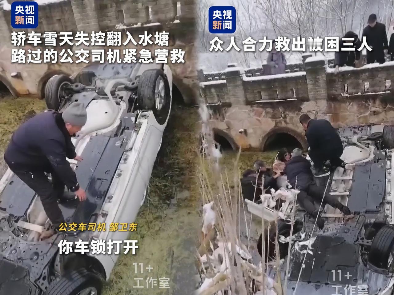 下雪天,河南一辆轿车突然四脚朝天躲在河里,小车驾驶员在车里大声地喊救命,却没人听见,一家三口在万念俱灰那一瞬间,奇迹发生了,路过的公共汽车驾驶员大哥看到冒烟救了她们。 北方的天气寒冷,加上大雪天气路况复杂路滑,雪花飘飘能见度低,一位女驾驶员妈妈操作不当,车辆不幸掉进河里,车内还有两个年幼的孩子,驾驶员拼命的在车内大声喊救命,可是求救声外面几乎听不到。 就在万念俱灰那一瞬间,一位细心的公共汽车司机大哥邹卫东,开车经过一座桥发现桥下有一股黑烟冒出,心里在嘀咕感觉有点不对劲,下雪天河里怎么会冒烟,于是停下车过去看一下,结果跑到桥边一看,吓了一跳。 一辆白色的小轿车四脚朝天躲在河里,他大声的喊车内人员是否能听得见他的声音,车门能不能打开,马上喊人来一起救你,邹卫东呼叫同事和村民帮忙,更让担心的是,两个年幼的孩子,天气这么泡在水里会不会冻伤,能不能坚持得住。 情况紧急,邹卫东二话不说跳入了冰冷的河水中,同事也来到现场,还有路过的热心群众一起参与救援,下到河里想打开车门,被卡住的车门根本打不开,一边安抚被困的母女,一边想办法打开车门。 在大家的齐心协力下用铁棍终于撬开门,先把小孩救出来,冰冷的河水湿透了衣衫,孩子冷得发抖,当妈妈获救那一刻,她激动得放声大哭,谢谢你们求救了我,和我的孩子。 看到这一幕,我都感动哭了,一个母亲带着两个孩子,困在车里出不来又那么冷,多无助啊,叫天不应叫地不灵,幸运的是他遇到了邹大哥,他不仅细心还在雪天中发现了她,施以援手还叫来同事和热心群众一起救她。 素昧谋面之人,纷纷施以援手,挽救了一个家庭,仿佛心意相通人间有大爱大地有温暖,这就是万众一心,下雪天和下雨天能见度低,各位开车不要开那么快哦,与其等待奇迹发生,不如安全行驶。