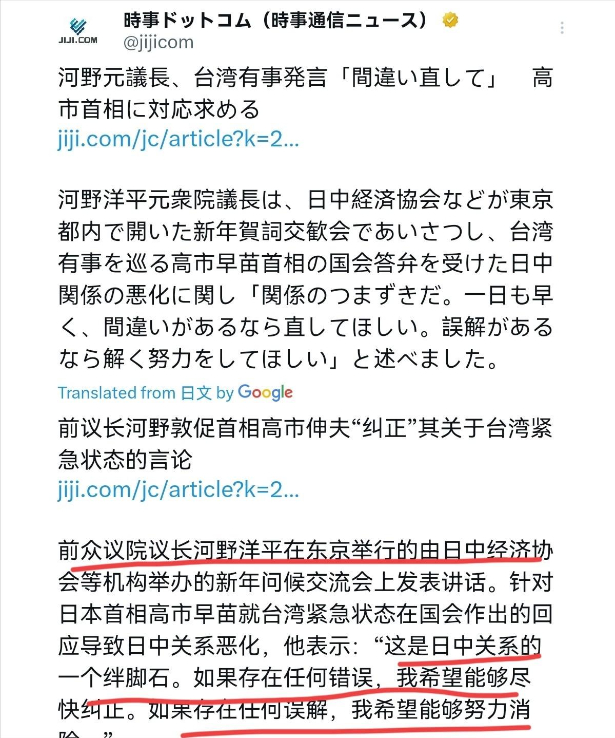 事态严重了!日本政坛大佬,资深政治家河野洋平公开出来对高市早苗施压了!1月7日,根据日媒报道,年届快90岁的前日本众议院议长河野洋平在新年问候交流会是表示,日本首相高市早苗在国会就台湾紧急状态发表的言论导致日中关系恶化,这是日中关系的一个绊脚石。 这样一位近90岁高龄、见证了中日邦交正常化全过程的资深大佬,选择在新年问候交流会这个重要场合公开表态,绝非一时兴起,背后必然是对当前中日关系走向的深切忧虑,也说明高市早苗的涉台言论已经引发了日本政坛理性力量的强烈警惕。 去年11月,高市早苗在日本国会公然宣称,“台湾有事”可能构成日本的“存亡危机事态”,这相当于变相发出了要武力介入台海问题的信号。 1972年《日中联合声明》里写得明明白白,日本政府充分理解和尊重中国政府关于台湾是中国领土不可分割一部分的立场,这是中日邦交正常化的政治基础,也是日本宪法明确要求诚实遵守的国际条约。 高市早苗的这番话,说白了就是公然挑战这个核心基础,不仅违背了日本的和平宪法,更是对中国内政的粗暴干涉,中方当时就明确表示了强烈反对和愤怒,要求她立即撤回错误言论。 而且河野洋平发声的这场新年问候交流会,本身就透着不寻常。按照惯例,中国驻日大使都会出席这类促进中日民间和经济交流的活动,但这次中国驻日大使吴江浩却罕见缺席,只派了公使罗晓梅出席,后者还当场表态,对中日关系正面临建交以来最艰难的局面深感遗憾。 大使缺席这一打破惯例的举动,已经很明确地传递出中方的态度——对当前中日关系的恶化现状无法接受,也不认可日方此前的敷衍应对。 而河野洋平选择在这样的场合发声,显然是想借助这个特殊的氛围,向高市政权施压,同时也向中方传递日本国内理性力量的态度。 他在致辞里特别强调,长期以来两国都是恪守《日中联合声明》精神才推动双边关系不断发展,可高市首相的言论却让人觉得这份联合声明的原则遭到了否定,还直言“这并非一个简单的绊脚石,日本政界别无他法,只能恢复这一立场”,话里的紧迫感和强硬态度,在河野洋平以往的表态中并不多见。 高市早苗的错误言论已经引发了连锁反应,日本国内的反对声音早就此起彼伏。共同社前不久做了一项调查,对114家日本企业的问卷结果显示,超过半数的企业都担心中日关系紧张会影响自身业务,其中33%的企业怕在华销售额下降,26%的企业担忧在华工厂和办事处运营受阻。 要知道,中日经贸往来密切,中国是日本重要的贸易伙伴和投资目的地,这些企业的担忧可不是多余的。 除了经济界,日本在野党更是直接“宣战”,日本共产党委员长田村智子就公开批评高市早苗的路线会破坏日本战后和平形象,把国民推向战争风险,要求她必须收回涉台表述。 就连自民党内也出现了分歧,不少议员私下质疑高市政权的外交策略,觉得她的轻率言论让日本陷入了被动。 1月6日,中国商务部发布公告,禁止所有两用物项向日本军事用户或用途出口,涵盖了高性能材料、精密机床、电子元器件等关键领域,这些都是日本国防产业的基础。 中方发言人明确表示,这就是对日本领导人涉台错误言论的回应,行动远比言语更有力量。这一禁令已经让日本军工企业开始担心项目延误,经济产业省也紧急启动了供应链审查,高市政权的压力可想而知。 现在河野洋平的公开施压,相当于给高市早苗出了一道必答题。作为日本政坛的资深前辈,河野洋平的表态不仅代表了自身的立场,更凝聚了日本国内希望维护中日友好、重视经济发展的理性力量。 他的核心诉求很明确:要么纠正错误言论,要么澄清误解,总之必须拿出实际行动修补中日关系。 可从目前的情况来看,高市早苗还在硬扛,始终不愿彻底撤回错误言论,只是用一些模糊的表述敷衍了事。这种遮遮掩掩的态度,不仅解决不了问题,反而会让中日关系进一步恶化。 台湾问题是中国的核心利益,是中日关系的红线,没有任何模糊空间。河野洋平之所以在近90岁的高龄还站出来发声,正是因为他清楚地知道,中日关系走到今天来之不易,是两国几代人努力的结果,不能被少数右翼势力的错误路线毁掉。 对于高市政权来说,现在已经没有退路,继续硬扛只会让日本付出更大的代价,无论是经济利益还是国际形象都会受损。 接下来就看高市早苗能不能认清现实,拿出应有的诚意和担当,纠正错误言论,回到遵守《日中联合声明》的正确轨道上来。毕竟,中日关系的稳定发展,不仅符合两国人民的利益,也对亚洲的和平与繁荣至关重要,这道必答题,高市早苗躲不过去,也敷衍不得。