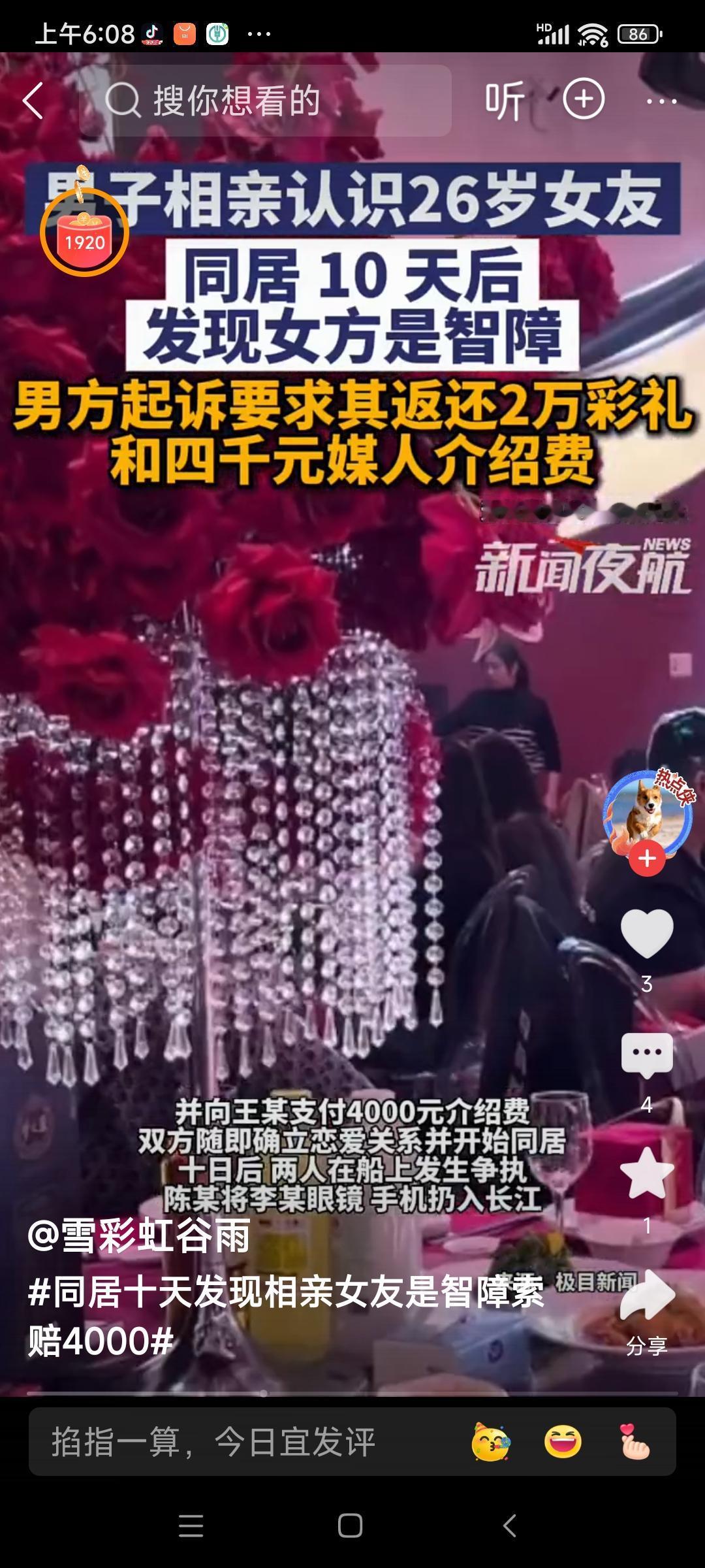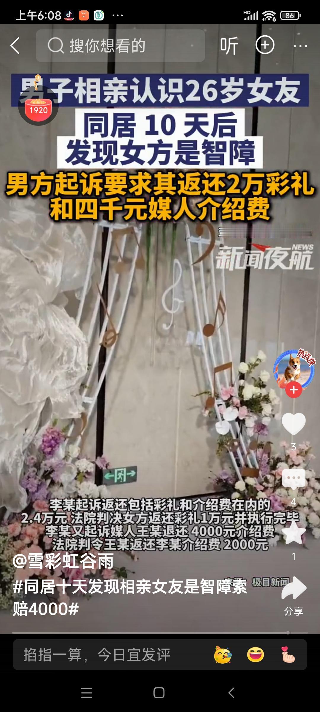 震惊!34岁男士相亲遇“特殊”女友,同居仅10天竟发现她是智力二级残疾,法院判决彩礼全退,媒人也要返还部分介绍费! (来源:潇湘晨报) 近日,一则令人震惊的婚姻案件在网络上引发热议。故事的主人公是一位34岁的男子,他通过相亲认识了一位26岁的女孩,原本以为是一段普通的恋爱,却在同居仅仅十天后,揭开了令人震惊的真相——女友竟然是智力二级残疾!这起事件不仅让当事人陷入困境,也引发了公众对于婚姻、残疾人权益以及婚前信息披露的广泛关注。 事情的起因要追溯到两个月前。这位男士经过多次相亲,最终在朋友介绍下认识了这位年轻的女孩。女孩性格温和,谈吐得体,外表也算得上清秀,两人一拍即合,迅速确定了交往关系。经过几次约会后,男方决定与女孩同居,共度未来。 然而,令人意想不到的是,仅仅同居十天后,男方在日常相处中发现女友的行为似乎有些不同寻常。她在沟通中表现出明显的理解障碍,有时会出现反应迟钝、表达不清的情况。起初,男方以为是生活压力或情绪问题,但随着时间推移,他开始觉得事情不对劲。 疑虑逐渐加深,男方决定带女友去医院进行详细检查。经过专业的心理评估,医生确认这位女孩属于智力二级残疾,智商大约相当于6-8岁的儿童水平。这一消息让男方震惊不已,也让他开始反思这段关系的真实性和合法性。 事情的复杂性不仅在于男方的个人情感,更在于婚姻法律的界定。男方在事发后,选择向法院提起诉讼,要求返还此前支付的1万元彩礼,并追究媒人的责任。 法院审理后认为,婚姻应建立在双方充分了解、真实信息的基础上。女方隐瞒了自己残疾的事实,属于严重的婚姻欺诈行为。依据相关法律规定,男方有权要求解除婚姻关系并退还彩礼。法院判决男方应全额退还已支付的彩礼1万元,同时,媒人也应返还一半的介绍费,以示对婚姻介绍过程中信息不实的惩戒。 此案一经曝光,立即引发社会广泛关注。有人认为,婚姻应建立在诚信基础上,隐瞒残疾事实属于欺诈,应依法追究责任;也有人担忧,残疾人士的权益应受到保护,社会应提供更多的理解与帮助。 专家指出,婚前信息披露极为重要。无论是残疾与否,双方都应坦诚相待,避免类似悲剧发生。同时,社会也应加强对残疾人士的权益保障,提供更好的康复和融入社会的支持。 此外,事件也引发了关于“相亲市场”的热议。有网友建议,婚介机构应加强背景调查,确保信息真实,避免类似事件再次发生。有人呼吁,法律应对婚姻欺诈行为加大惩处力度,保护普通百姓的合法权益。 这起案件折射出社会对残疾人权益保护与婚姻诚信的双重关注。一方面,残疾人士应享有平等的婚姻权利,不应因身体残疾而被歧视或排斥。另一方面,婚姻是一项严肃的法律行为,双方应以诚信为本,避免欺骗和隐瞒。 从法律角度来看,婚前信息披露义务是保障婚姻合法性的重要环节。隐瞒残疾事实,可能构成欺诈,法院有权判决解除婚姻关系并退还彩礼。同时,婚介机构也应承担相应责任,确保信息的真实性。 社会层面,公众应加强对残疾人士的理解和包容。很多残疾人士通过努力也能过上幸福的生活,社会应为他们提供更多的支持与帮助。而对于普通人而言,面对相亲对象时,了解全面信息,理性判断,才能避免类似悲剧的发生。 这起事件提醒我们,婚姻不仅仅是两个人的事情,更关系到社会的诚信与公平。无论对方是否有残疾,坦诚相待、尊重彼此,才是建立幸福婚姻的根本。对于残疾人士,社会应给予更多理解和包容,让他们在平等的环境中追求幸福。 同时,法律的保护也不可或缺。只有建立完善的婚姻信息披露机制和严格的法律责任追究体系,才能有效防止婚姻欺诈,保障每个人的合法权益。让我们共同努力,营造一个诚信、包容、温暖的社会环境,让每一个生命都能被尊重、被爱护。大龄姑娘相亲 相亲尴尬一幕