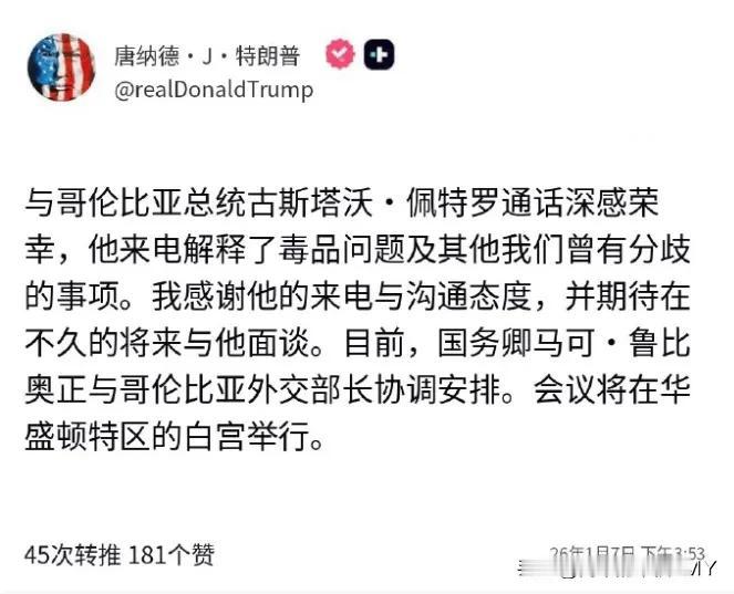 哥伦比亚总统给全球上了一课!哥伦比亚总统古斯塔沃·佩特罗,短短三天时间,他完成了从高调叫板白宫到主动致电示好的华丽转身,这般教科书级别的操作,给一众夹缝中求生存的国家狠狠上了一课。 1月4日,佩特罗在公开讲话中火力全开,对着特朗普隔空放狠话。“如果你想把我关进监狱,那就试试看能不能做到。如果你想让我穿上橙色囚服,那就放马过来。哥伦比亚人民将走上街头捍卫我。” 字字铿锵,句句带刺,这般强硬姿态瞬间引爆舆论场。这番话被全球媒体争相报道,普遍解读为拉美国家对美国霸权的一次罕见正面硬刚。要知道,拉美向来被视作美国的“后院”,多数国家面对美国施压往往选择隐忍,佩特罗此番表态,无疑是捅破了一层窗户纸。 话音未落,佩特罗紧接着放出大招。他当众公布一张标注详细的地图,直指美军曾在太平洋某处实施秘密轰炸行动,并且直言该次军事打击造成了无辜平民死亡。 这一手反击堪称精准狠辣,彼时白宫正多次指控佩特罗“与毒枭勾结”,试图将他钉在舆论的耻辱柱上。佩特罗此举,分明是要转移公众视线,把舆论焦点从自己身上挪开,反手将美国的霸道行径公之于众。 一边是白宫的无端指责,一边是美军滥杀平民的铁证,两相对比之下,佩特罗的舆论处境瞬间逆转。谁也没能料到,这场剑拔弩张的对峙,竟然在短短三天内出现惊天逆转。 佩特罗主动拨通白宫的电话,态度来了个180度大转弯。1月7日,特朗普在社交媒体上轻描淡写地写道:“很荣幸接到佩特罗总统来电,他解释了毒品问题,以及其他我们曾有分歧的事项。” 更让人意外的是,两人竟已敲定近期在白宫会面。前脚还在街头喊打喊杀,后脚就拨通电话谈笑风生——这转变之快,简直比热带雨林的天气还难捉摸。难道佩特罗怂了?还是他从一开始就打着“以退为进”的算盘? 其实,真正的政治高手,从来不是靠嗓门大赢天下。古人云:“大丈夫能屈能伸。”佩特罗这一手,看似前后矛盾,实则深谙“刚不可久,柔不可守”的道理。 他先以雷霆之势抢占道义高地,把美国推上道德审判席;再以务实姿态回归谈判桌,为国家争取实际利益。这种“先声夺人,后发制人”的策略,不正是小国在大国夹缝中求存的生存法则吗? 试想,若他一味强硬到底,结果会怎样?美国制裁加码,援助断供,边境封锁,经济雪崩……哥伦比亚本就深陷毒品与暴力泥潭,哪经得起这般折腾? 佩特罗不是不懂理想主义的浪漫,但他更清楚,总统办公室的椅子,坐的是责任,不是口号。老百姓要的是面包,不是演讲稿上的豪言壮语。正所谓“识时务者为俊杰”,能在风暴中稳住船舵,才是真本事。 再说特朗普那边,何尝不是顺势而为?他需要一个“幡然醒悟”的拉美盟友来装点门面,证明自己外交手腕依旧犀利。佩特罗主动来电,正好给了他台阶下。 双方各取所需,表面握手言和,内里却仍是暗流涌动。这场三天内的“变脸秀”,哪里是简单的认怂或妥协?分明是一场精心编排的政治双人舞——一个进,一个退;一个攻,一个守;节奏拿捏得恰到好处。 从隔空叫板到主动示好,佩特罗的三日变脸,看似出人意料,实则暗藏玄机。哥伦比亚作为拉美地区的国家,经济上高度依赖美国市场,军事上也与美国有着千丝万缕的联系。 硬碰硬的对抗,短期之内或许能收获舆论掌声,长期来看,却极有可能招致美国的严厉制裁,最终损害的还是哥伦比亚的国家利益和民众福祉。佩特罗的精明之处,就在于他深谙“识时务者为俊杰”的道理,懂得在合适的时机收敛锋芒,以退为进。 这番操作,完美诠释了小国在大国博弈中的生存智慧。硬碰硬不是勇气,是鲁莽;懂得变通,才是真正的大智慧。 佩特罗用实际行动证明,面对强权压迫,一味的强硬对抗并非上策,灵活务实的外交策略,才能在波谲云诡的国际局势中,为国家和人民谋求最大的利益。