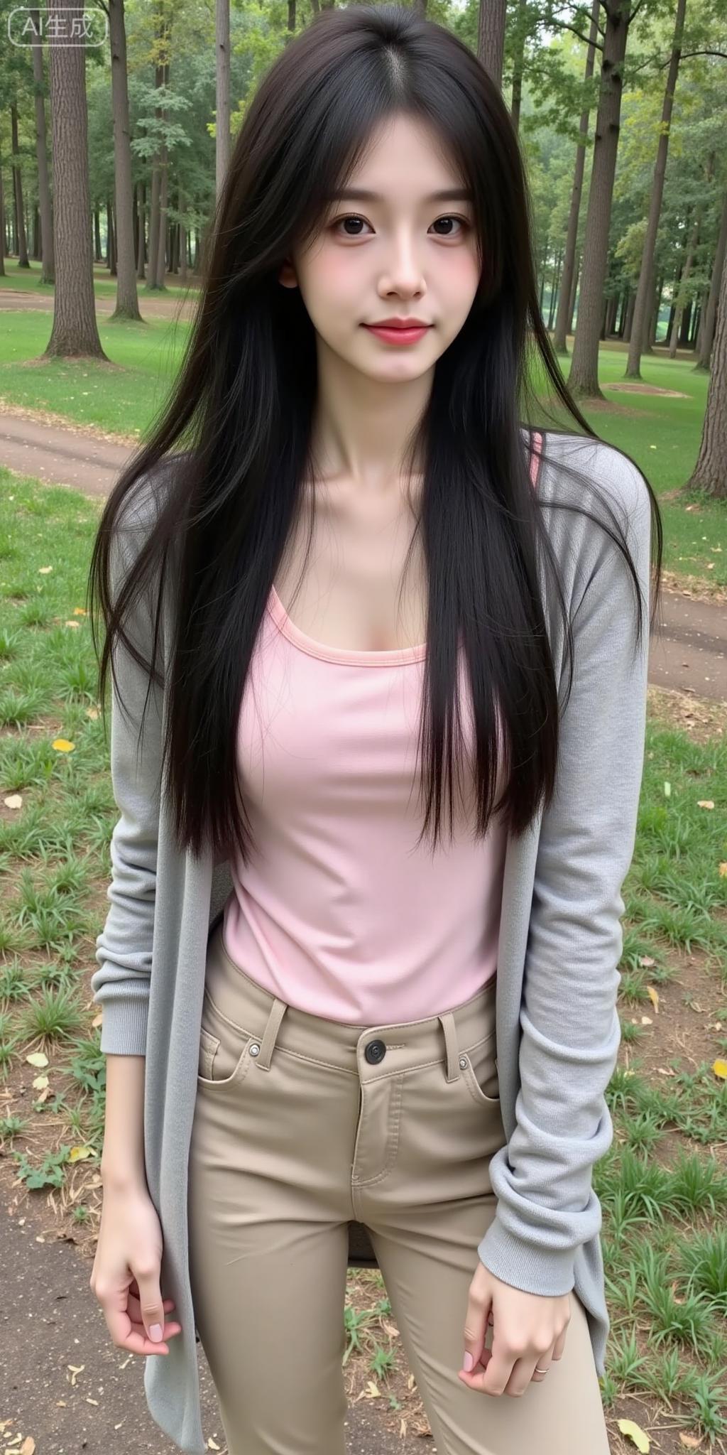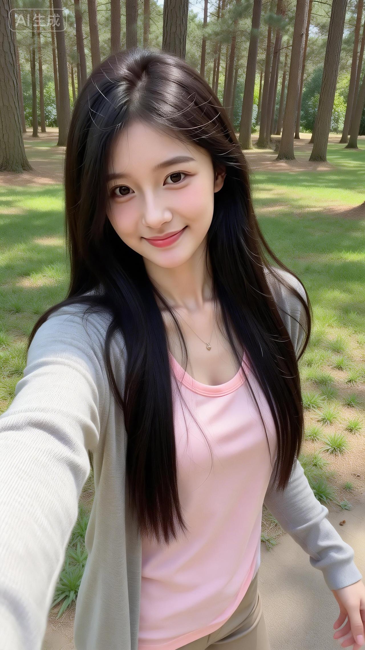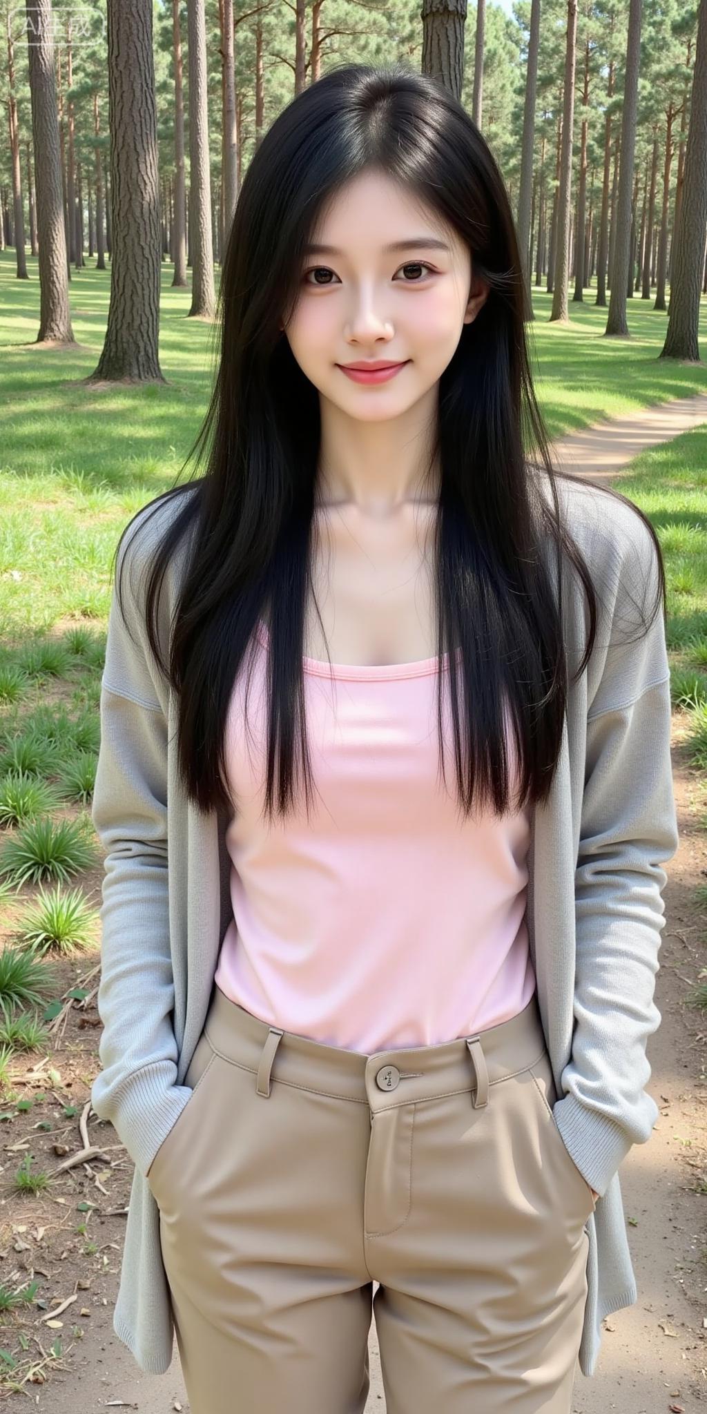 森林里的软甜系氧气少女 粉T+浅灰开衫,温柔得像春日里的棉花糖~长发衬得眉眼更软,颈间细链添了点精致✨ 阳光穿过树林落在她身上,连空气都裹着清甜的气息~粉系少女感穿搭 粉绿色穿搭