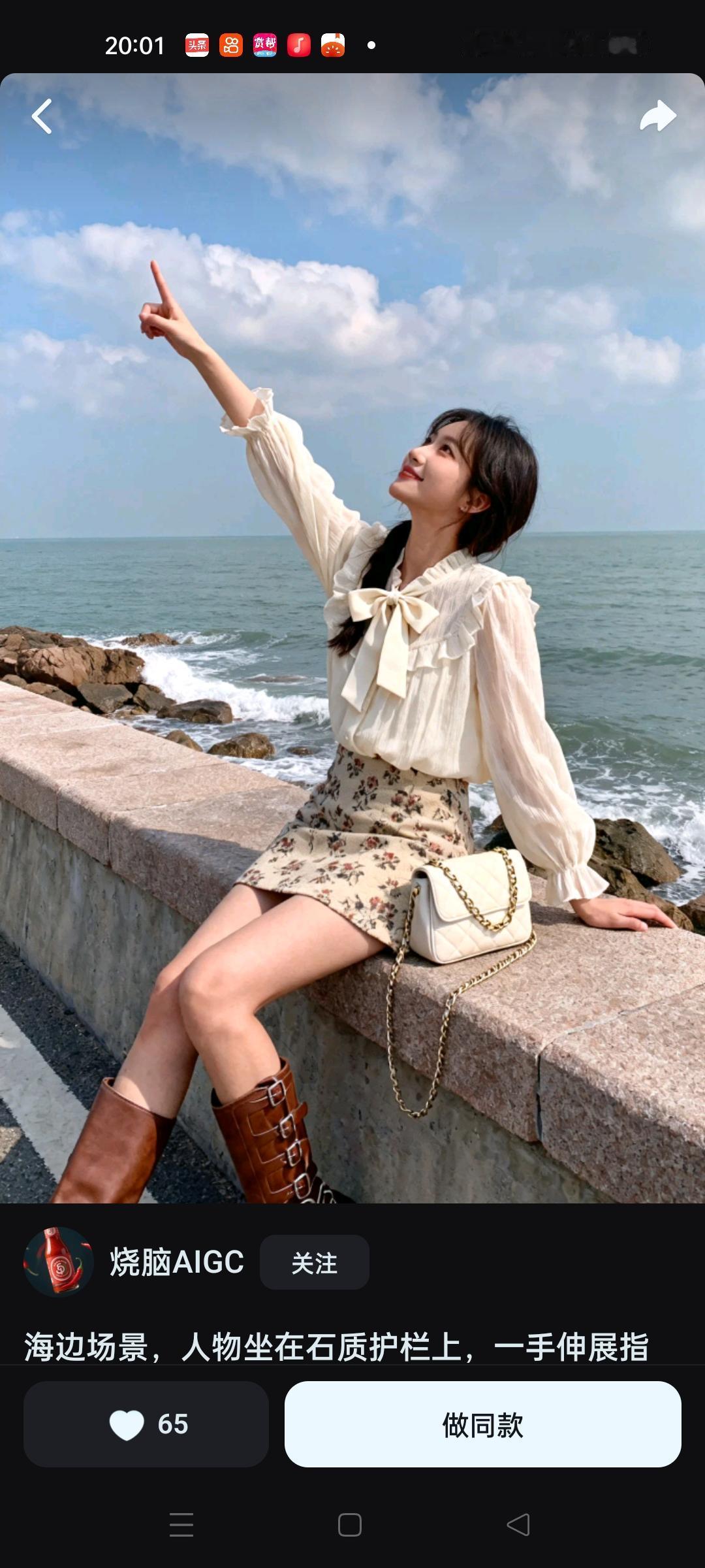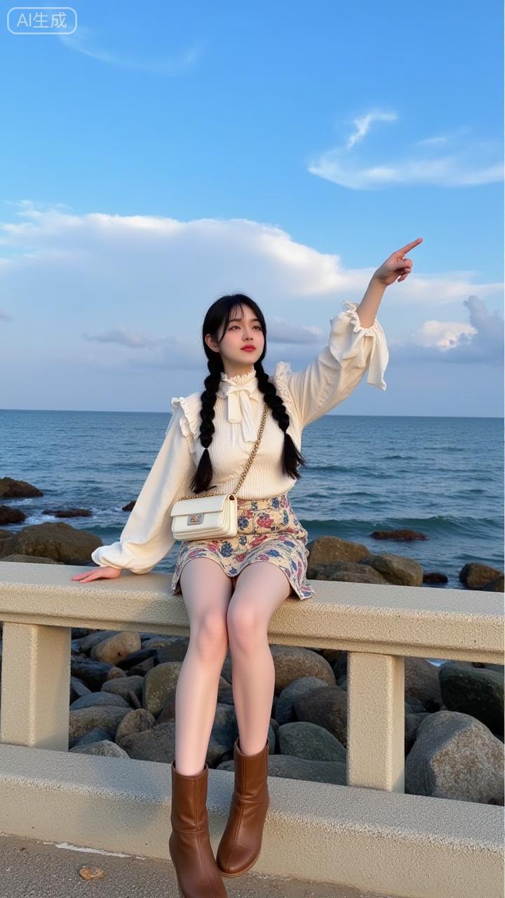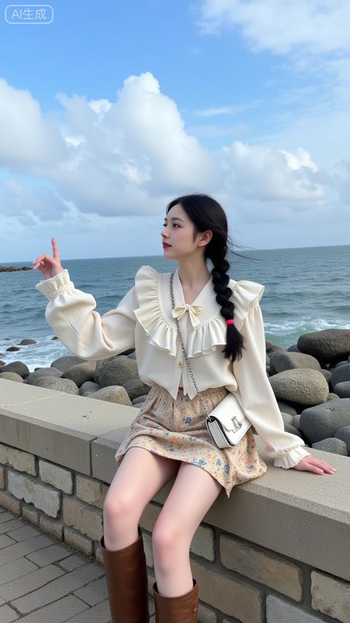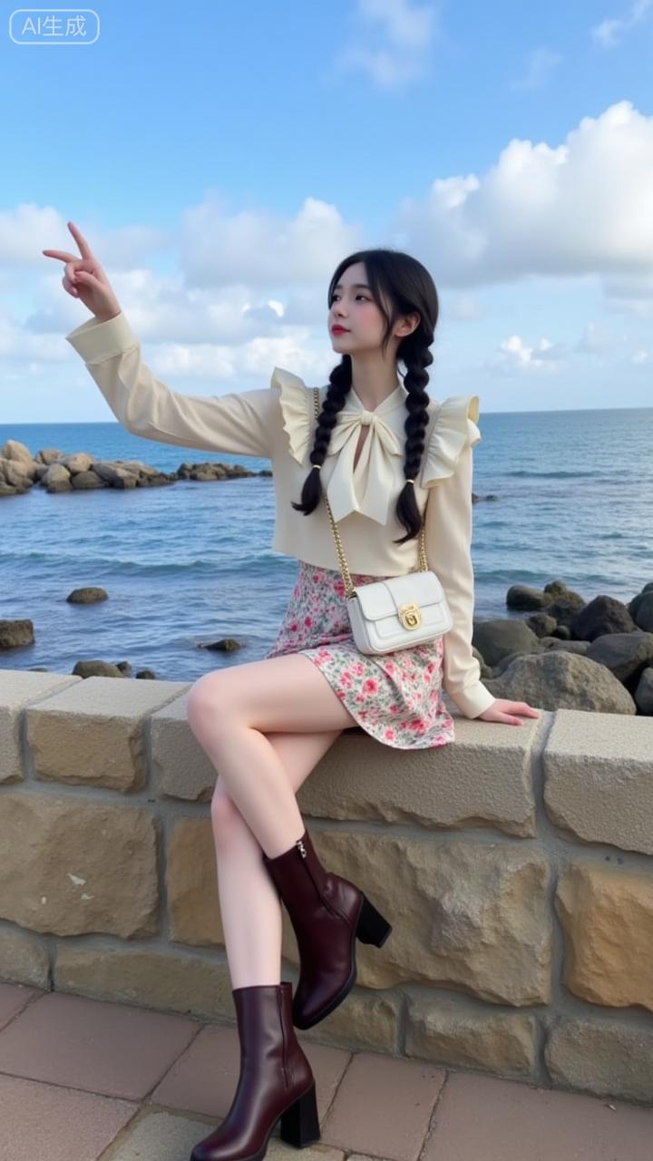 海边石墙上,麻花辫姑娘一袭碎花裙,笑指远方。碧海蓝天为幕,浪花轻卷礁石,清新气息扑面。海边拍照裙 度假风拍照裙子