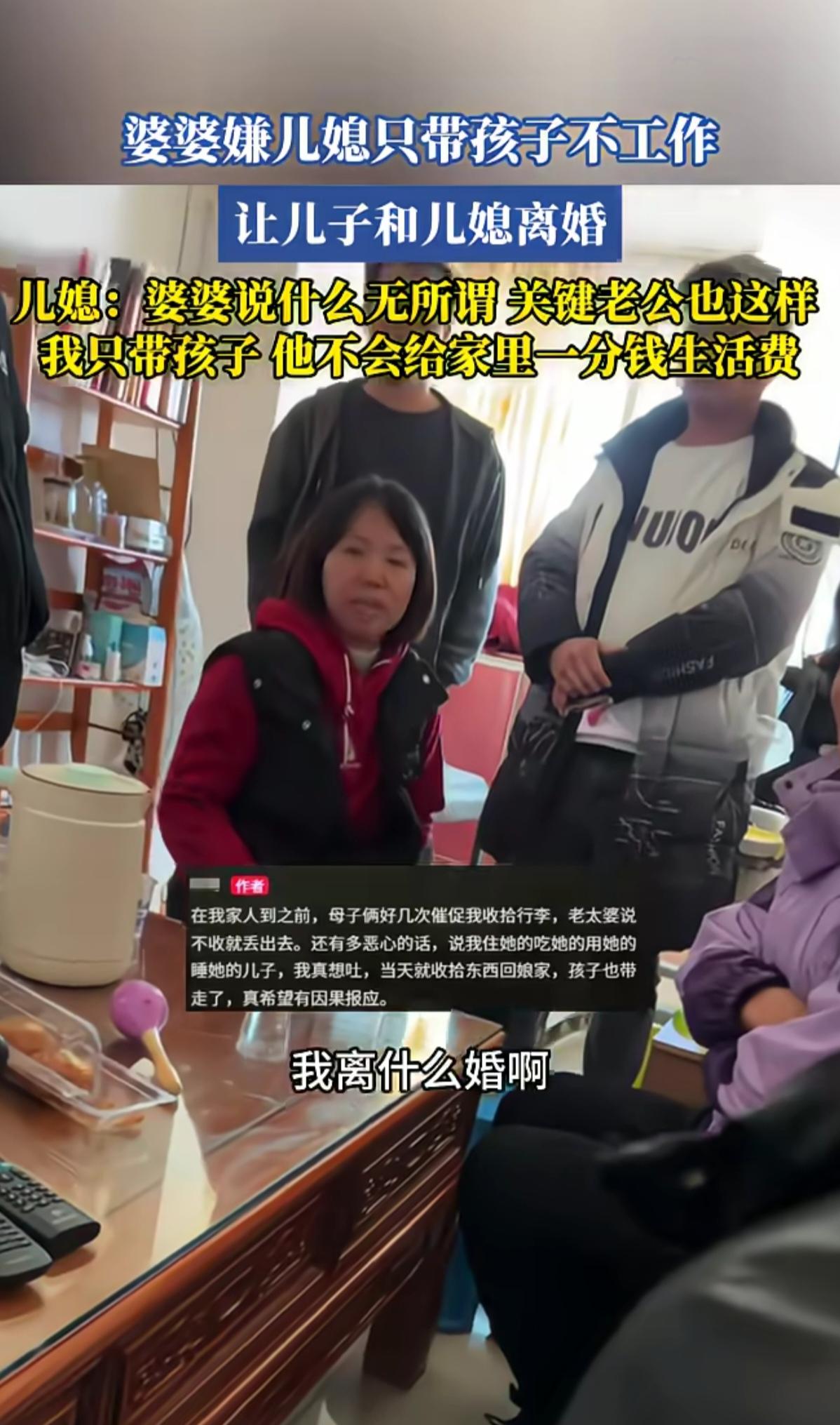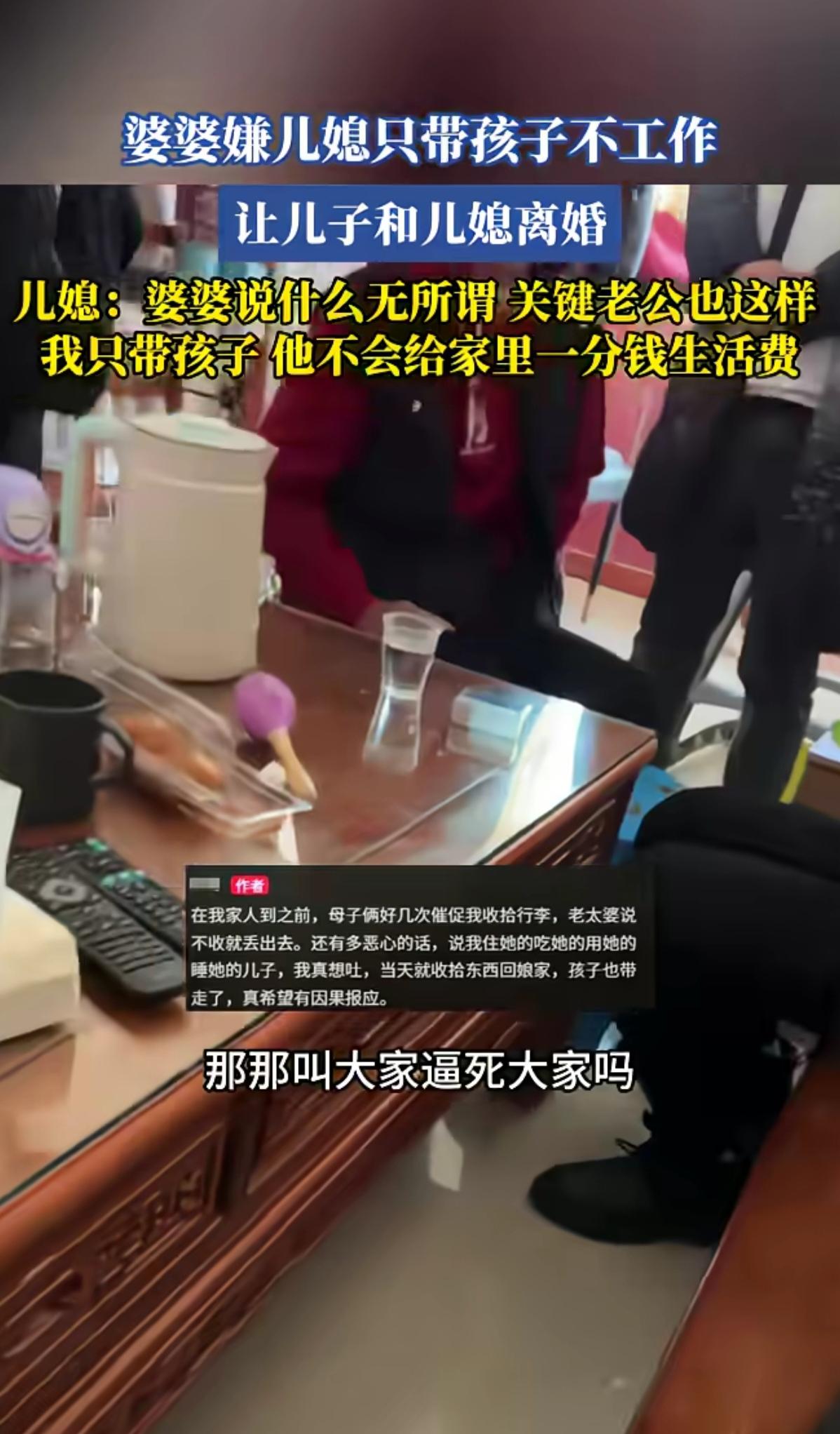 婆婆嫌儿媳妇只带孩子不上班,逼儿子儿媳离婚,关键老公也是这个态度,她带孩子生活费都不给 网友:离!赶紧离啊,这么好的机会,上班不比带孩子轻松多了 碰到这种既要又要的婆家,你就是忙成一个陀螺他们都能挑出刺儿来,不信你就试吧,就算你又带孩子又上班,她们还是会逼你离婚的 如果能狠下心,舍下孩子,还是离了吧,就这样闹来闹去的家庭,孩子的成长肯定会受影响,不如自己去好好工作,自己过的好了,还能给孩子撑腰 图片源自网络,侵权必删