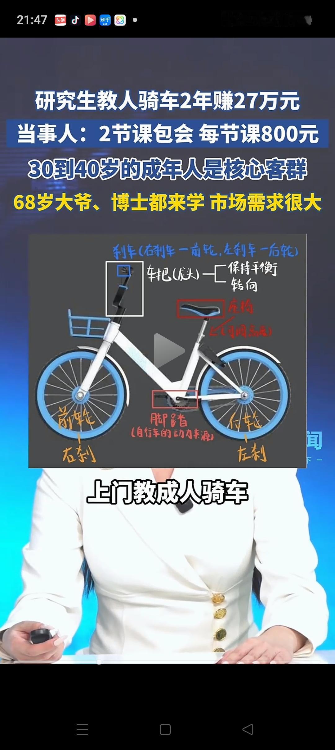 “越来越看不懂了”,上海一研究生教人骑自行车,一节课800块钱,二节课包学会,吸引了很多人慕名而来!有68岁的大爷,也有30岁的博士,2年赚了27万[捂脸][捂脸] 听到这里,相信很多80后都懵了!因为在80后看来,这都是必备的技能,自己在家里练习两圈就会了,没啥难度。 但这个男生能发掘这个赛道,还有这么多的客户,肯定也是有过人之处的。不仅仅是教骑车技术到位,情绪价值可能也给的足足的。 不得不说,还是年轻人的脑子灵活,这也能赚到钱[笑哭]